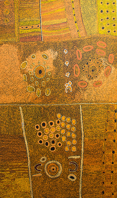 "Le paysage s'offre à nous dans cette œuvre, avec une vue du ciel lointaine. En prenant de la hauteur différents segments apparaissent dans l'œuvre et soulignent des zones spécifiques du territoire Aborigène. Les montagnes ou blocs rocheux sont suggérés par des ovales. Les personnages par des formes en U, vues de haut. L'ensemble se distingue avec délicatesse".