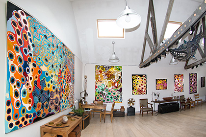« En avant première, vue de l’exposition d’art Aborigène sur le « Spinifex Art Project ». Leur histoire est extraordinaire comme leur lieu de vie, un des plus éloignés sur terre, entre le Great Victoria Desert et la plaine de Nullarbor en Australie.