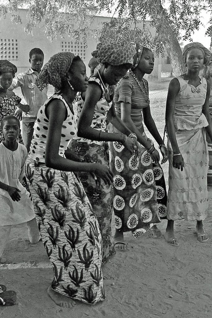 Jeunes filles esquissant une souple chorégraphie. En certaines occasions comme les baptêmes, les festivités peuvent être publiques mais alors femmes et hommes dansent séparément.
