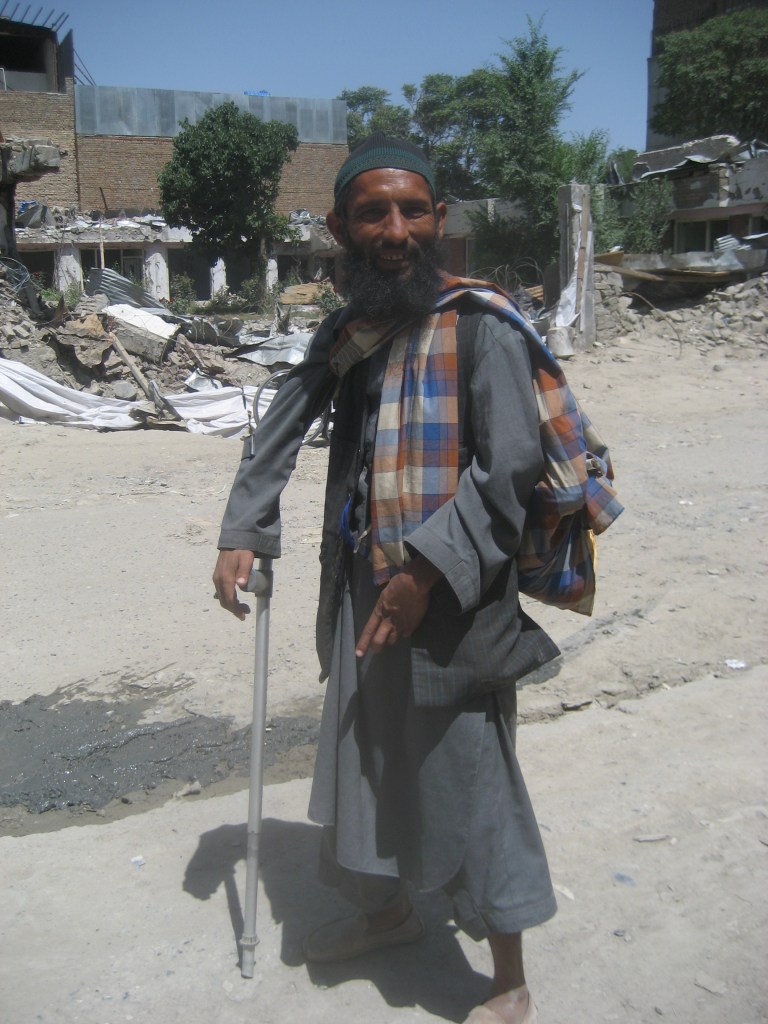 Un mendiant assez joyeux devant les restes de la guest-house de la délégation grecque explosée à la bombe quelques mois plus tôt. Comme ma guest-house était à proximité il y avait peu de chance que je sois victime d’une autre bombe dans un avenir proche.