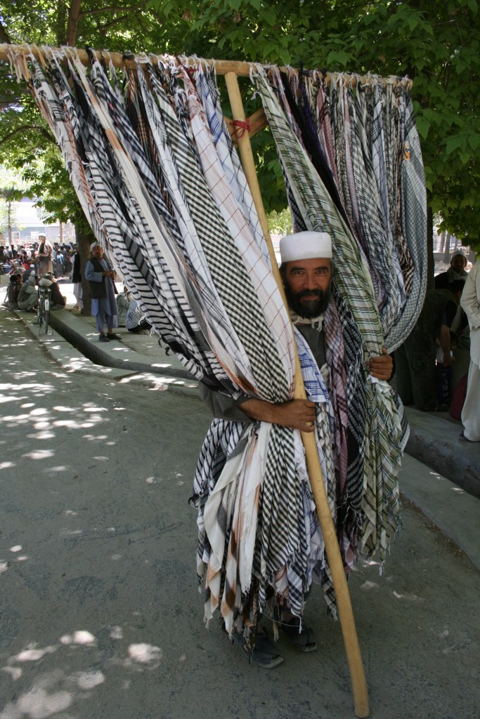 Vendeur de keffieh. Ces grands châles servent à tout. Se couvrir la tête, le visage, s’essuyer la sueur ou la bouche et les mains après avoir mangé, s’assoir par terre.