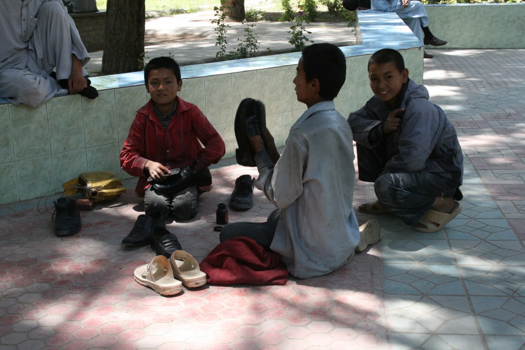 Les cireurs de chaussure, profession universelle des pays pauvres, commencent très jeune. La paire de tongues blanches au premier plan est à disposition des clients s’ils veulent être chaussés ou se déplacer pendant que leurs propres chaussures se refont une beauté.
