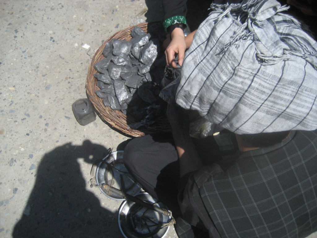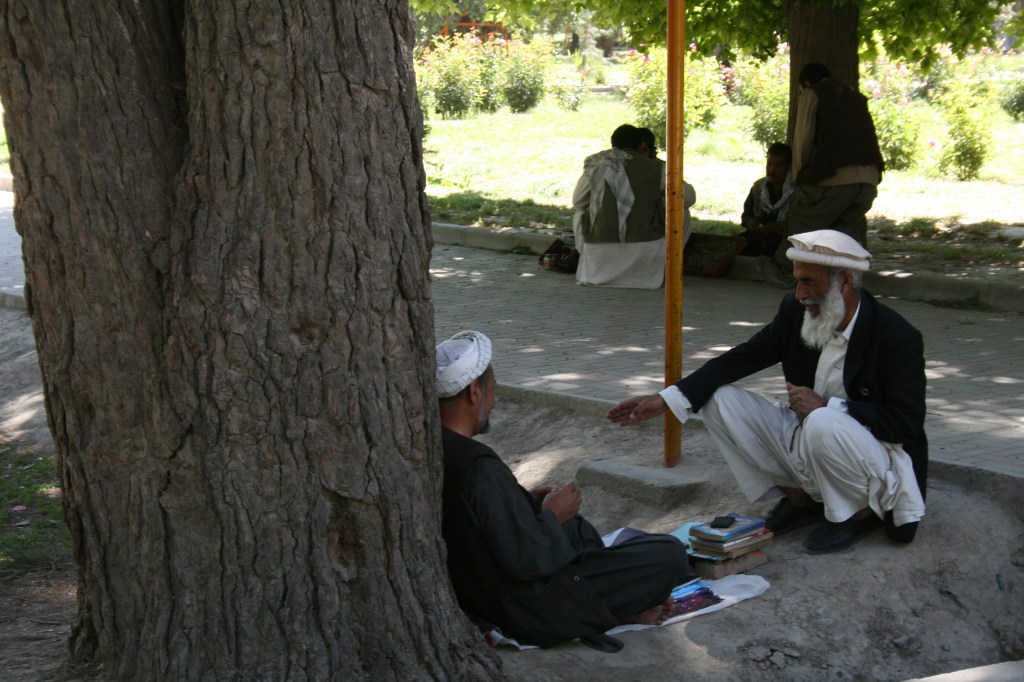 Au parc « Shar-e-Now » au centre de Kabul : comme souvent dans ces pays il y a un monde fou un lundi en pleine journée. Qui donc travaille ? Ce vendeur d’amandes, émondées ou non, soulève ses « jupes » pour chercher « sa » bourse.