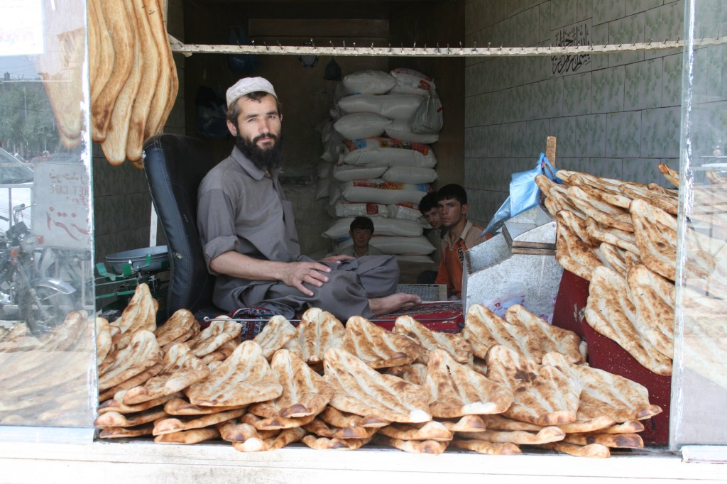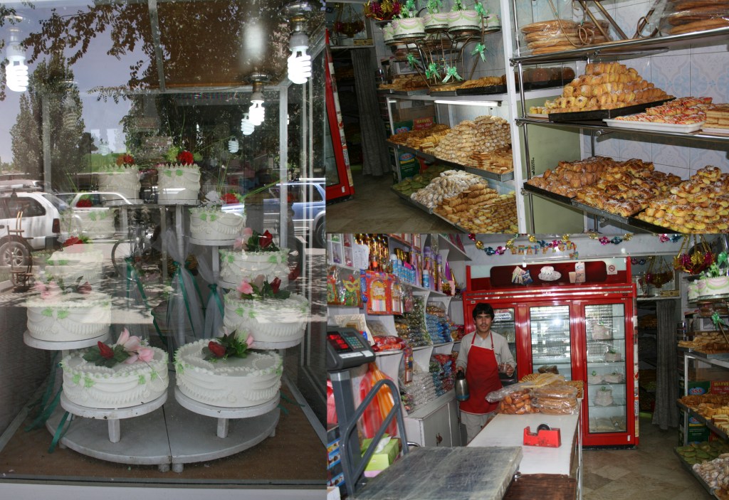 Et pour finir une belle anecdote qui illustre l’hospitalité afghane. Je prenais des photos de la vitrine de ce pâtissier pleine de gros gâteaux crémeux et kitchs à l’occidentale (photo de gauche). Me sentant un peu coupable de prendre des photos et de ne rien lui acheter je suis entré dans la boutique qui heureusement proposait aussi des pâtisseries orientales (photo à droite en haut) et en pris 2 petits (je venais de déjeuner). Le jeune patron (photo à droite en bas) essaya de m’expliquer quelque-chose en Dari dont je n’ai compris qu’un mot « tchaï » (le thé). Il me proposait une tasse de thé comme c’est souvent le cas aussi dans les pays arabes. Il me fit assoir sur un tabouret. Je croyais qu’il avait un thermos prêt pour me verser une tasse. Non point. Il est parti chercher de l’eau pour la faire bouillir et me préparer un thé frais. Pendant que l’eau bouillait il me présenta 3 autres petites pâtisseries sur une assiette en carton. Saturé par un copieux petit-déjeuner à mon hôtel je me suis forcé, par politesse, à en manger 2 autres. Une fois ma tasse de thé ingurgitée je sors mon portemonnaie pour payer. Il me fait comprendre que je ne lui dois rien. Je lui ai offert un magnet de la Tour Eiffel en souvenir.