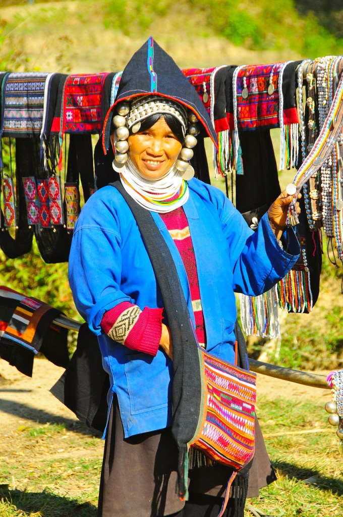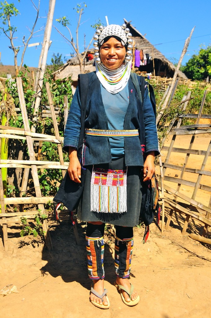 Les vêtements, tissés à la main sont constitués d’une robe, d’une veste bleue teintée à l’indigo et d’un tablier brodé et coloré. Cette tenue est égayée par des jambières multicolores et la tête des femmes est ornée par de magnifiques casques en tissu sur lesquels sont accrochées de nombreuses boules argentées. Le visage est entouré de boules plus grosses et parfois des pièces de monnaie en argent, héritées des colonisateurs, viennent compléter la coiffe. Des colliers de perles de différentes tailles et de différentes couleurs viennent entourer le cou. Chiquer la noix de bétel reste une pratique habituelle chez les femmes et les hommes les moins jeunes, ce qui donne un charme discutable à leur bouche.