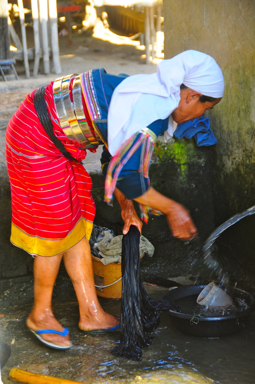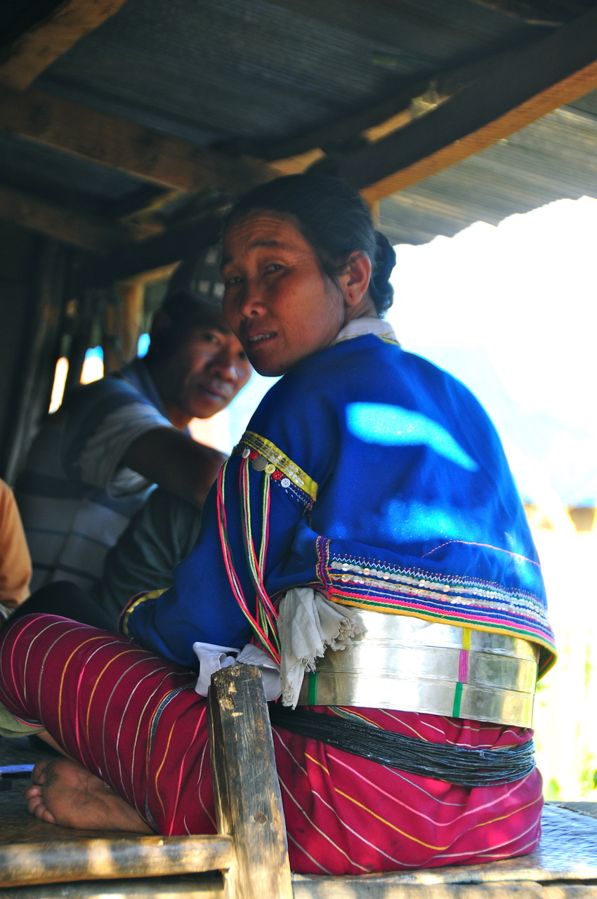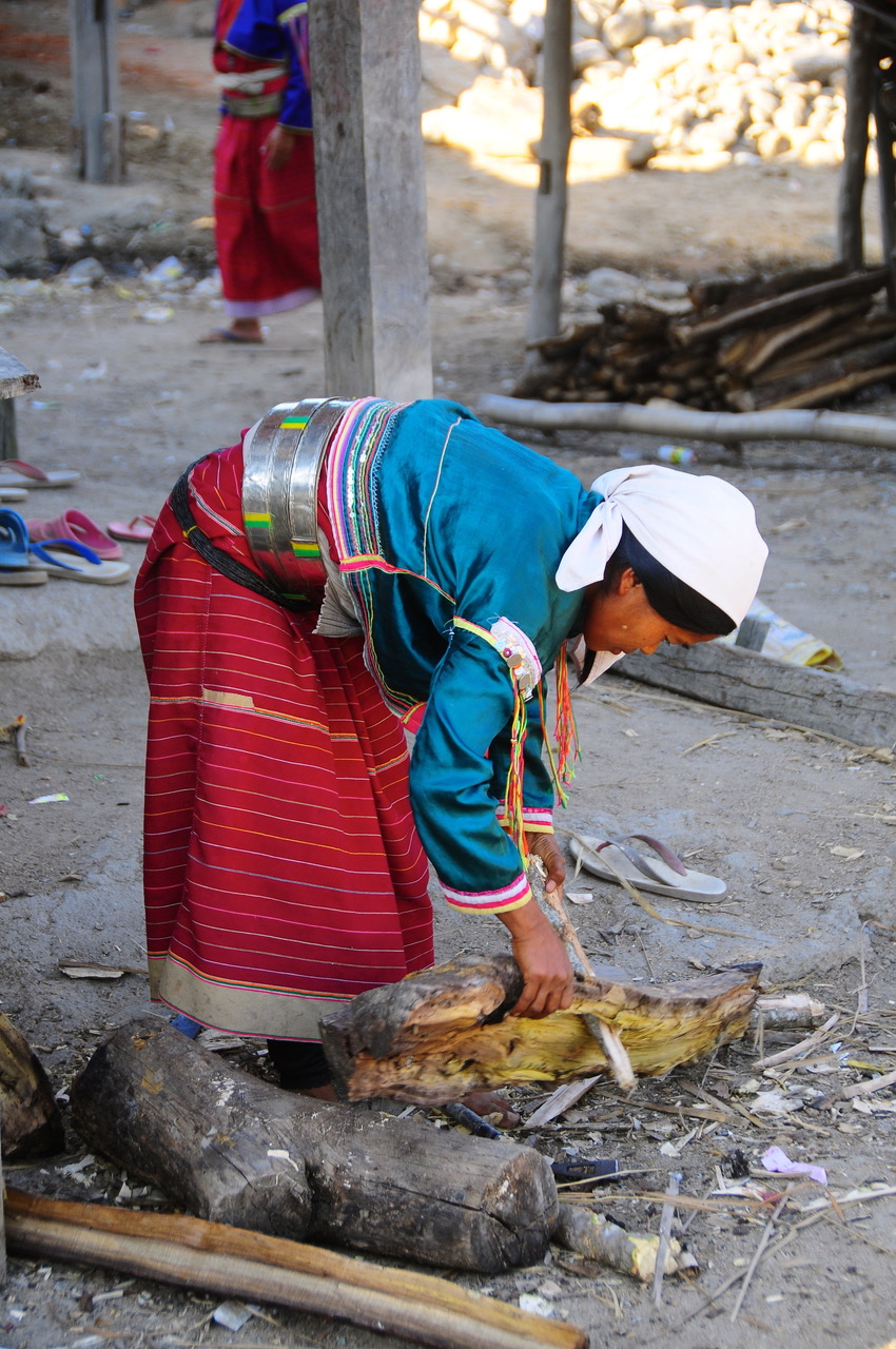 Dans un des villages du « Triangle d’or » à WAN PAUK se concentrent plusieurs familles Palaung, les Palaung argentés en raison du cerceau qui repose sur leurs hanches. Les femmes sont très uniformément vêtues d’une jupe rouge écarlate, bordée de jaune et d’une courte veste, généralement bleue ou noire.