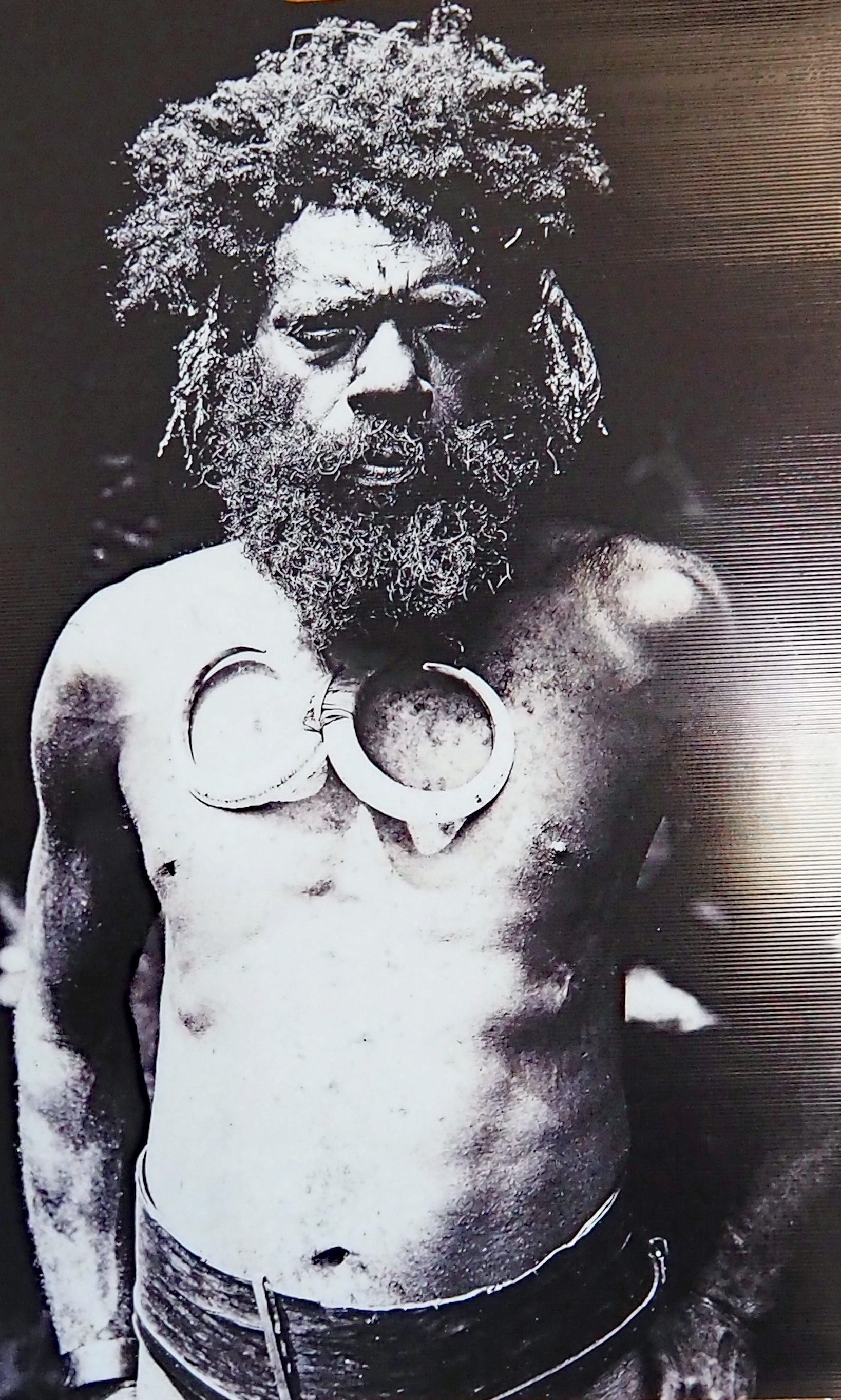 A gauche un chef coutumier porte un pendentif de dents de cochon recourbées, signe d’une confrérie masculine basée sur la hiérarchie de grades. Lui fait face un chef de 2019, aussi élevé dans la hiérarchie semble-t-il si l’on en juge par la taille et l’enroulement des dents de cochon pendues à son cou. Si tous deux portent la ceinture en écorce qui maintient l’étui pénien de fibres, ce qui les différencie sans aucun doute est le nombre de cochons sacrifiés lors du rituel nécessaire à ce niveau de prise de grade. Les anthropologues contemporains du chef photographié par les Johnson rapportent des tueries de plusieurs centaines de cochons (l’un d’entre eux, dont je ne retrouve pas le nom, en mentionne deux mille..) aujourd’hui ce chiffre est divisé par dix, vingt, voire plus, tant pour des raisons financières que d’évolution des coutumes.