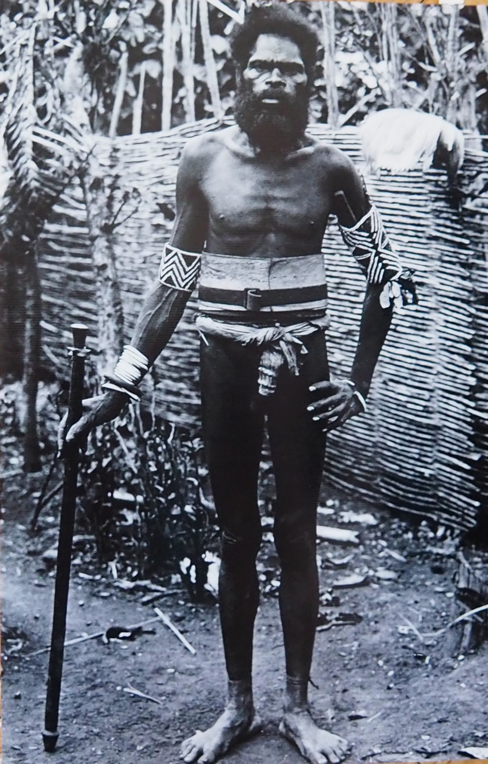 De 1914 à 1915, l’anthropologue anglais John Layard séjourne dans les Small Islands, ilots, du nord-est de Malekula, principalement Atchin et Vao où il rencontre le chef coutumier Tethlong Maturu, photographié ici à gauche en 1919, portant une ceinture d’écorce recouverte de tapa blanchi à la chaux (coquillages brulés) maintenue par une double ceinture, dont une en cuir, style militaire très apprécié des hommes d’influence ni-van. Selon Layard ce chef héréditaire a été un informateur de première classe.