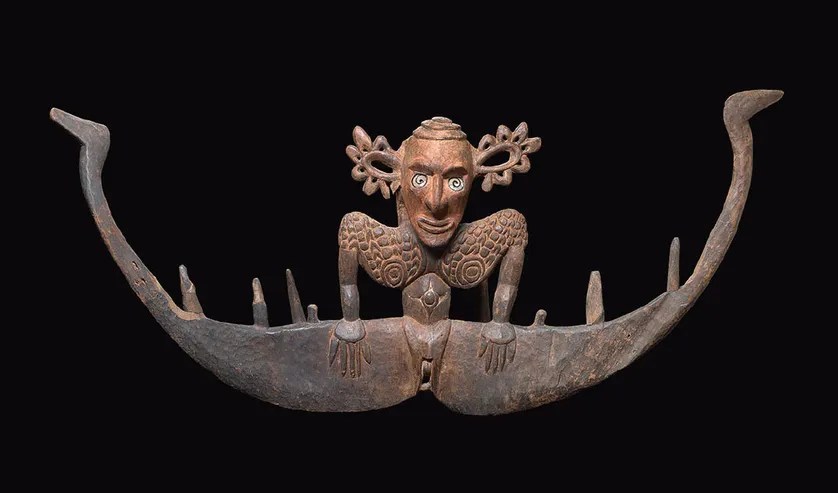 Photo : Crochet du village de Yentchanmangua : Sculpture iatmul de la vallée du moyen Sepik – Bois, coquille d’huître perlière, fibres73 × 166 × 45 cm. Groupe linguistique iatmul, village de Yentchanmangua. Collecté par Adolf Roesicke lors de la Kaiserin-Augusta-Fluss-Expedition de Berlin en 1912. Berlin, Ethnologisches Museum, inv. VI 54998