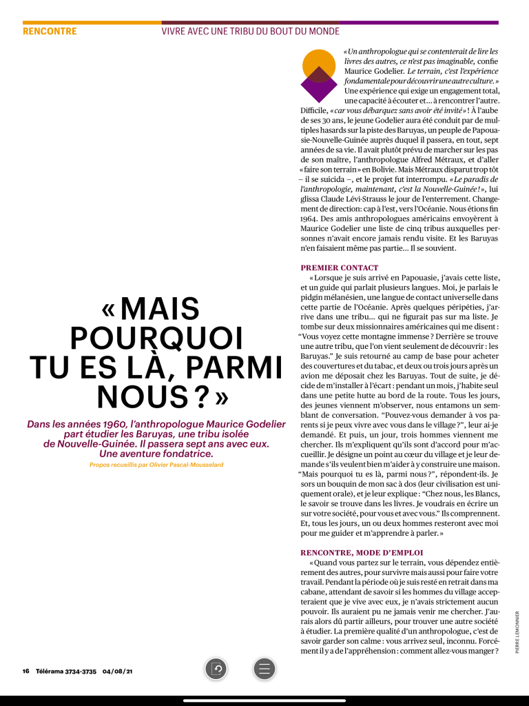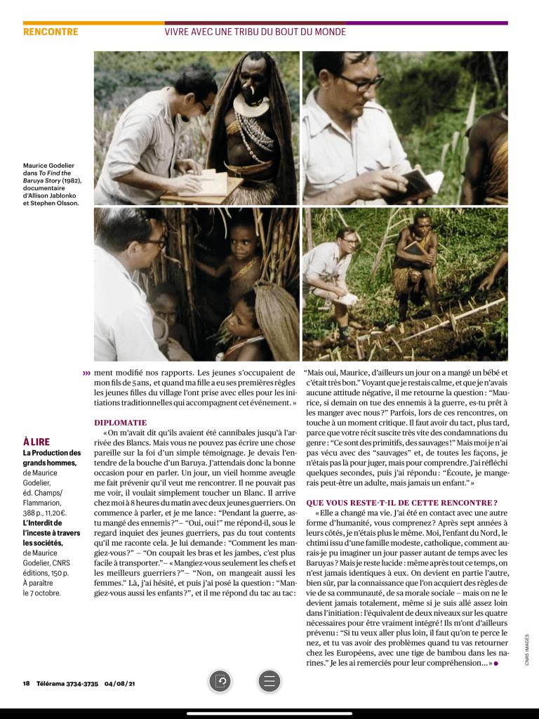 Voici l’article qui vient de paraitre dans le cadre d’un gros dossier sur la rencontre. Où il est toujours agréable de retrouver l’humour de Maurice Godelier.