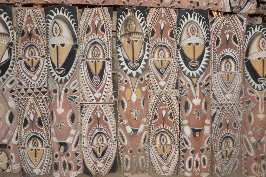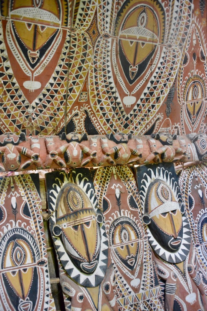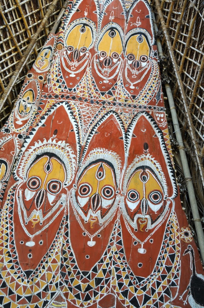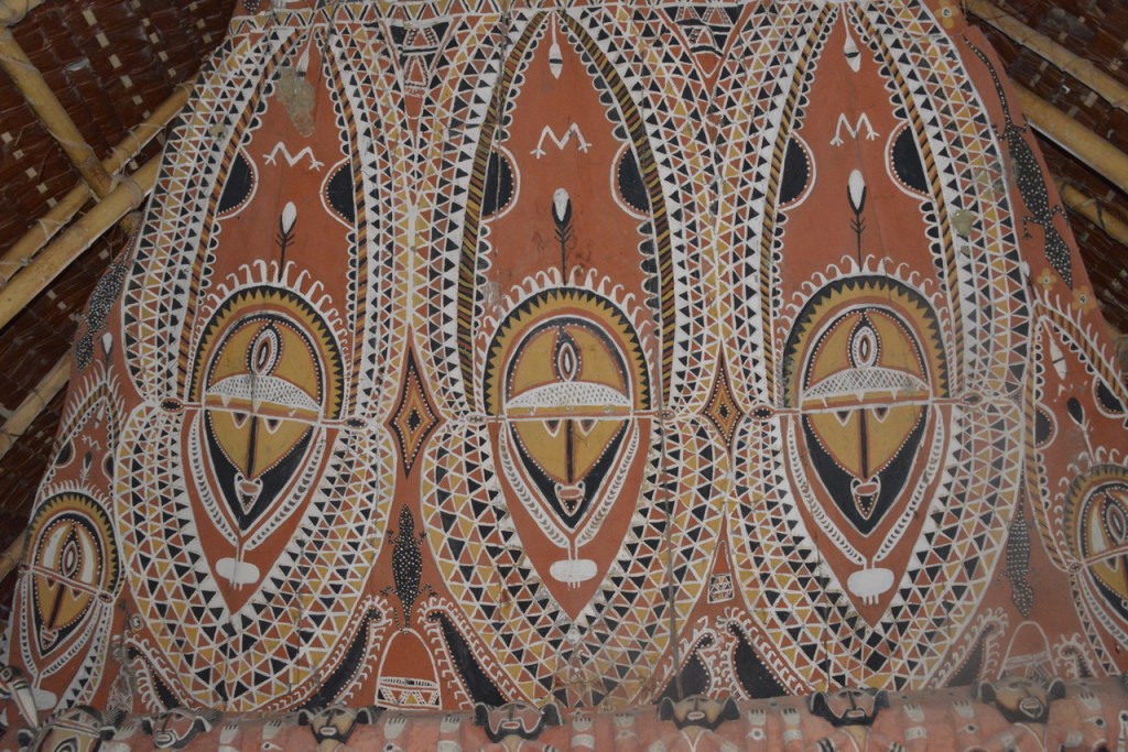 Les Haus Tambaran (Maison des Esprits ou Maison des Hommes), appelées chez les abelam Karambo sont les plus spectaculaires de Papouasie-NouvelleGuinée. Leur pignon somptueux dont la hauteur va de 20 à 30 mètres est incliné vers l’avant. C’est une façon de protéger leur décoration et plus encore d’abriter les hommes qui s’y réunissent, du soleil ou de la pluie. Cette façade est sculptée et peinte avec comme couleurs dominantes le jaune, le marron, le blanc et le noir. La frise du bas représente la généalogie des ancêtres Nggwal ou Nggwal Ndu et au-dessus ce sont les esprits qui regardent les étoiles. De part et d’autre, en bas, on remarque la présence de deux casoars qui se font face sur la karambo de Kumininbus.. Au cours de nos voyages, en 2008 puis en 2017, nous en avons vu deux, celle de Kumininbus et celle de Apangaï. Elles sont bâties sur le même modèle mais celle de Apangaï commence à se dégrader. On songe à la démonter (pour la revendre… ?) et à en construire une autre.