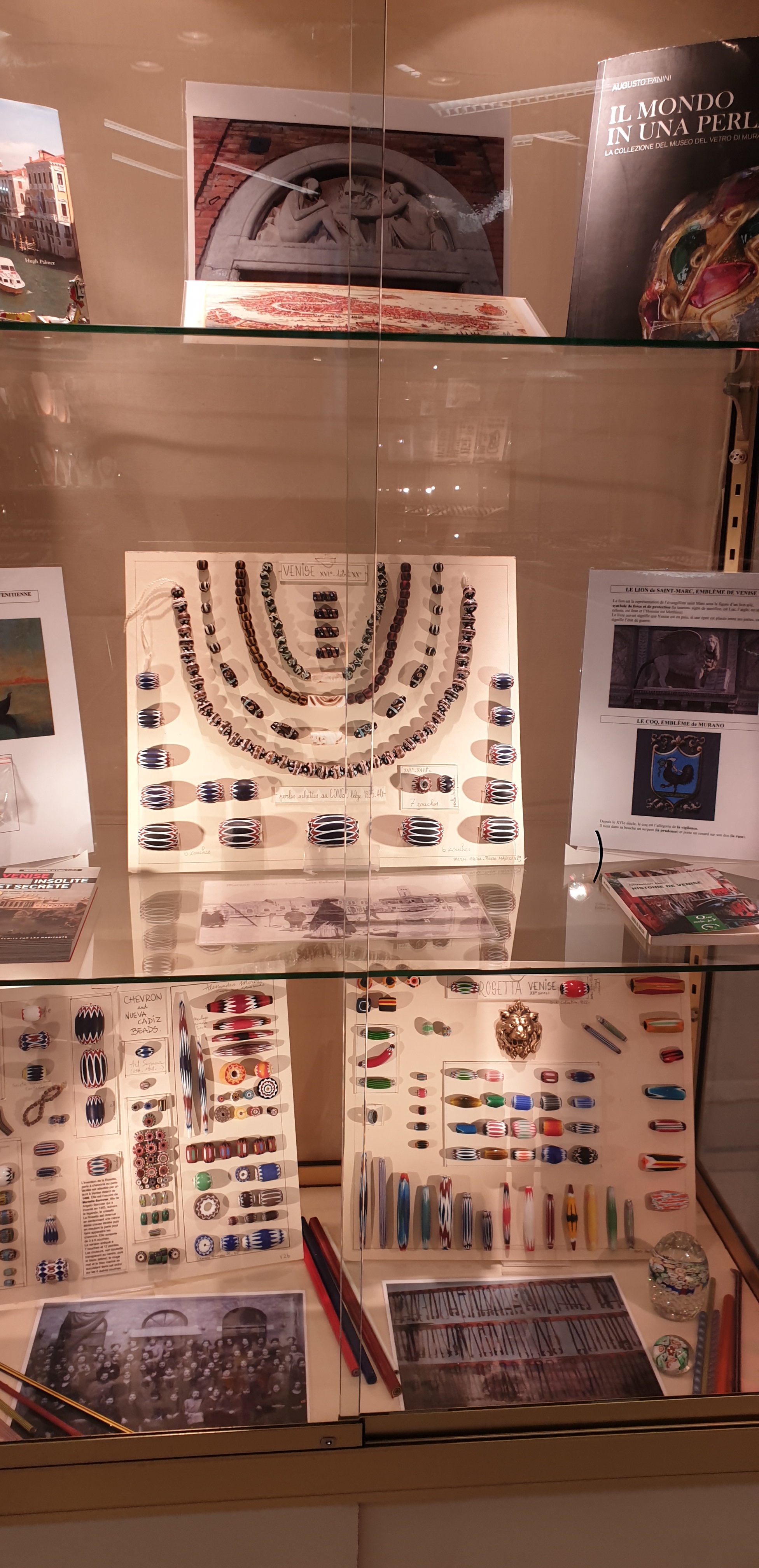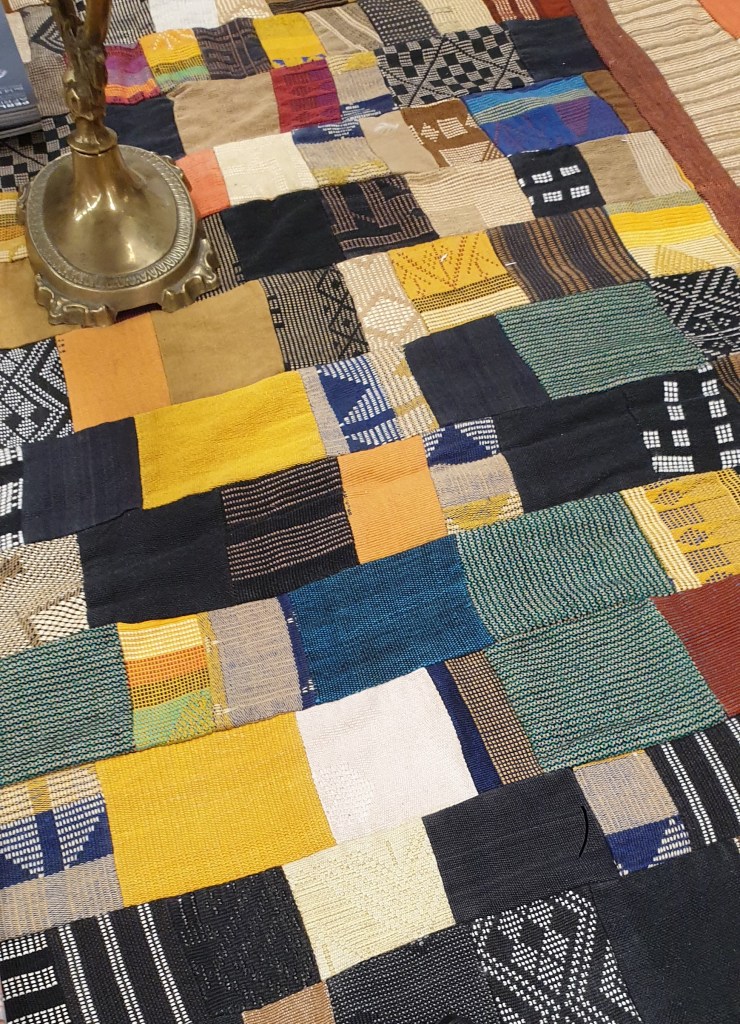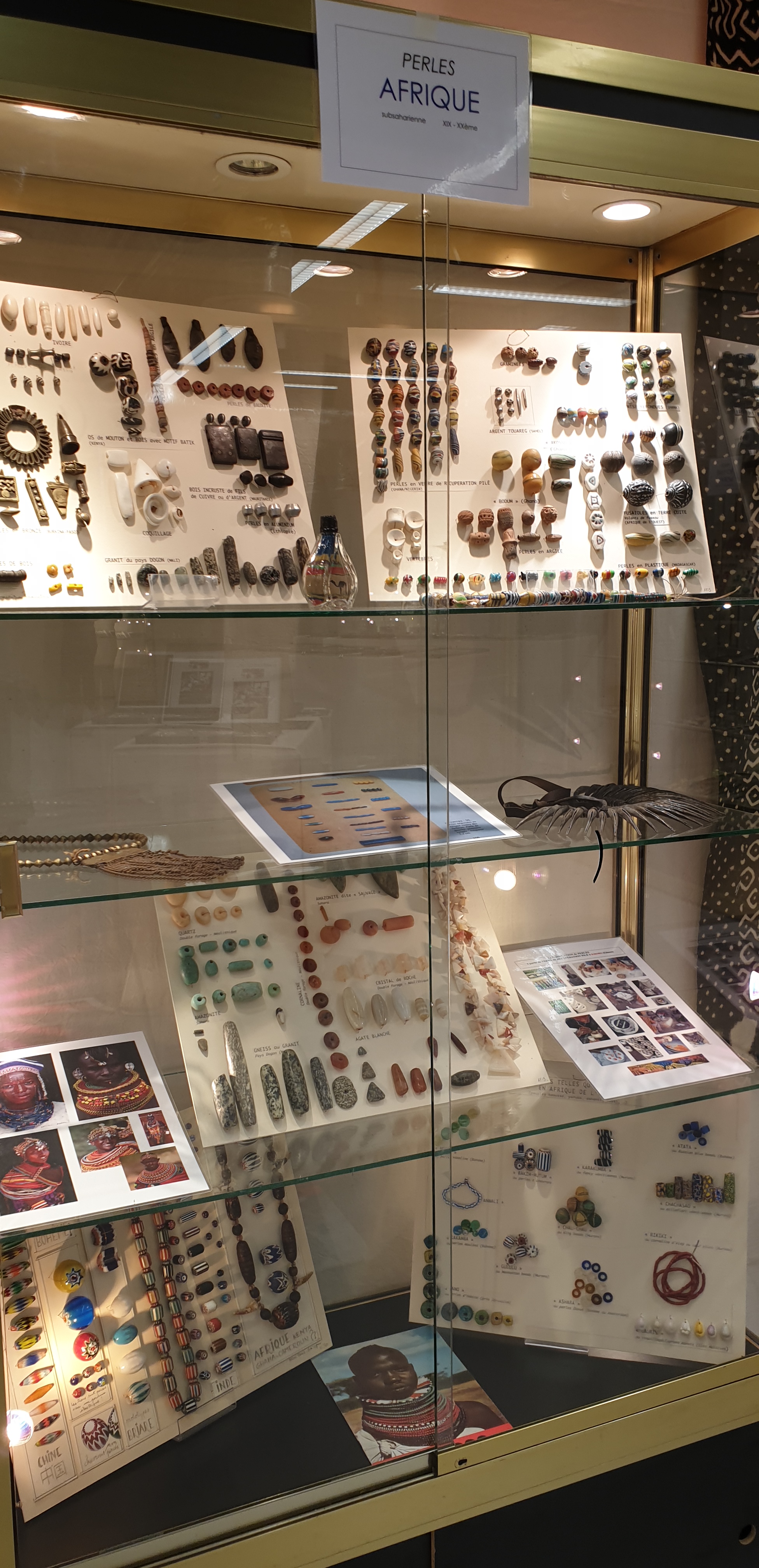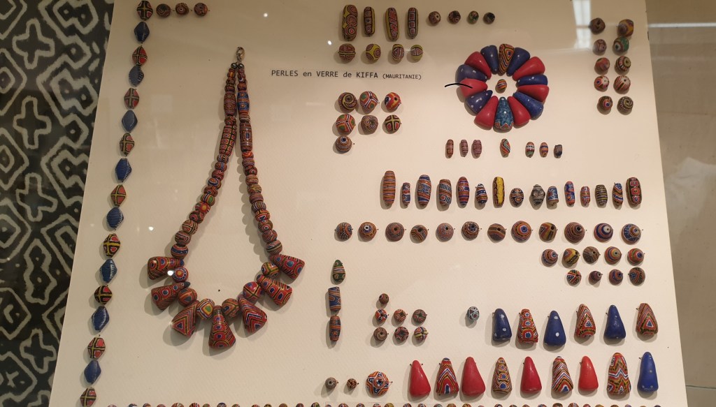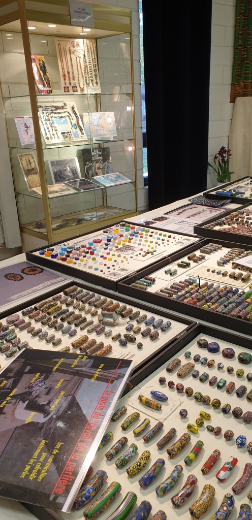 Dimanche matin 14 novembre…je sais bien que nous avons rendez-vous pour une visite commentée le lundi 29 novembre à 15h aux Puces Marché Dauphine, mais je ne peux pas attendre, je m’y rends tout de suite puisque l’exposition ouvre ce matin. Je ne m’attendais pas à un si beau et vaste lieu, aéré malgré les très nombreuses vitrines de perles et les tissus kenté installés en décoration. Documentation à consulter, nombreux ouvrages essentiels en vente, ainsi que des colliers. C’est ici qu’il faut venir pour comprendre l’importance du trafic des perles dès le 7è siècle dans la traite négrière et le commerce transatlantique, participant donc à l’essor du capitalisme. Des centaines de perles vous attendent, des perles vénitiennes qui furent tant appréciées des roitelets africains aux perles fabriquées par les Africains, en pâte de verre ou en coquillages ou métal, c’est un pan important de l’histoire des relations de l’Afrique avec l’Europe qui nous est exposé. Merci et bravo à Marcia de Castro et Guy Maurette qui depuis des années œuvrent à la reconnaissance de ces merveilles d’un art pas assez reconnu, le travail du verre et de la pâte de verre..