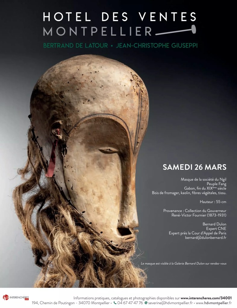-Samedi 26 mars vente à l’Hotel des Ventes de Montpellier d’un masque N’Gil récemment révélé par ses propriétaires.