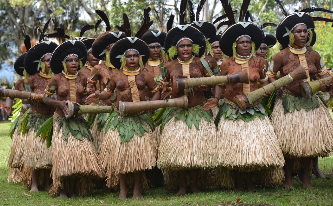 Au cours de leur danse, le suli muli, les jeunes filles sont parfaitement alignées, ce qui exprime la solidarité du groupe et donne une impression de puissance. Chez le Enga, les kundus, les tambours sablier, sont sommaires. Ils ne sont pas sculptés et ne comportent pas de poignées. Ils sont tenus d’une main sur la partie la plus mince et frappés de l’autre pour donner le rythme à la danse. Les grandes coiffes circulaires sont noires et sont composées avec les cheveux des danseuses et des danseurs. Des feuilles et de la mousse sont disposées autour des visages. Chez les femmes les coiffes sont dominées par une grande et unique plume de casoar. Le regard est souligné par une ligne noire au niveau des yeux. Le corps des hommes et des femmes est enduit d’une argile brune. Les jupes des femmes sont composées en fibre naturelle et celles-ci sont agrémentées à la taille par des feuillages.