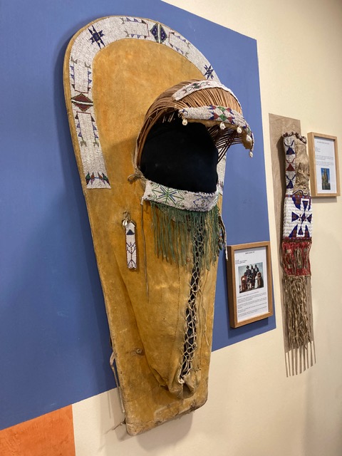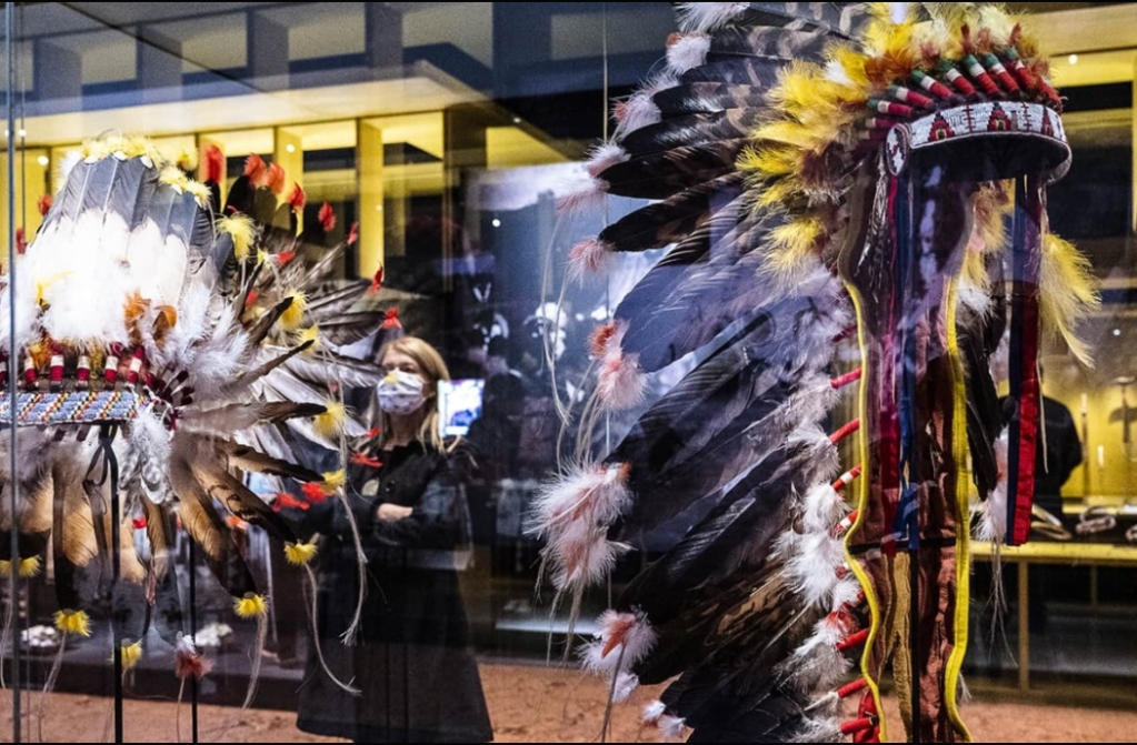Ensuite l’exposition « Sur la piste des Sioux » (jusqu’au 28 août 2022) qui s’attache à déconstruire les clichés qui continuent à sévir sur les Indiens. Exposition très documentée, de la découverte de l’Amérique du Nord aux westerns et la vie des Indiens de nos jours. Nous retrouvons les parures des Indiens des Plaines vues le matin.