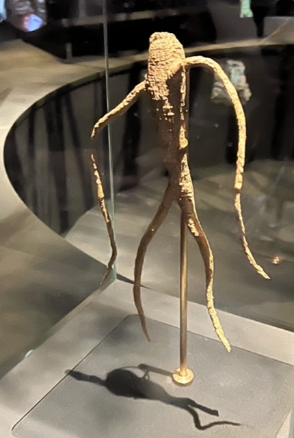 D’abord la toute nouvelle exposition temporaire, « Magique » (en collaboration avec le muséum de Toulouse, jusqu’au 5 mars 2023) ; malheureusement en pleines vacances scolaires, cette expo dans l’obscurité quasi totale était envahie d’enfants « enthousiastes » qui nous ont un peu gâché la visite, apparemment ils ont, eux, beaucoup apprécié tout ce qui concernait les tours de magie et la prestidigitation ; nous, nous avons pu revoir de nombreux objets magiques, boli, kafigeledjo, talisman et amulettes, dont certains prêtés par Claire et Pierre Ginioux.