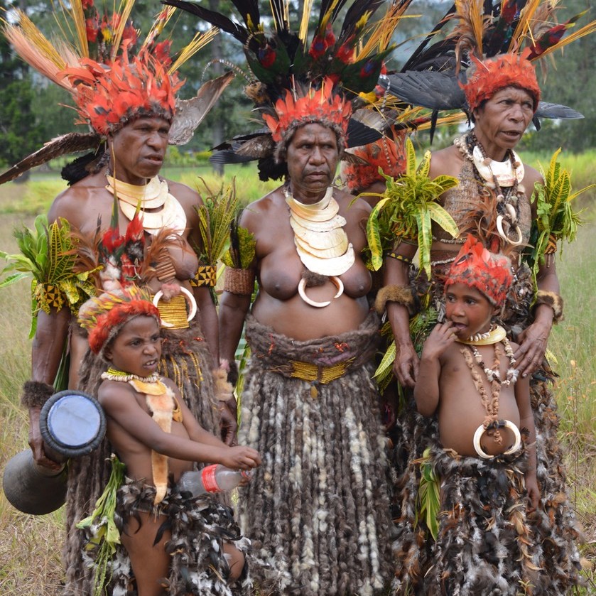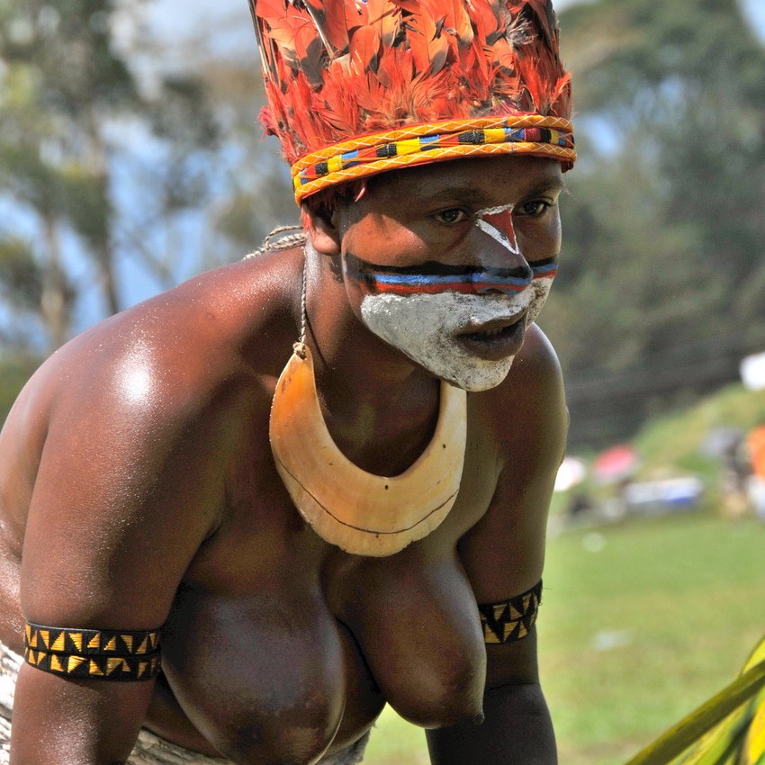 Chez les femmes comme chez les hommes les hautes coiffes sont bordées au niveau du visage par de nombreuses plumes rouges avant que s’élancent de longues plumes noires provenant du casoar. Les femmes portent autour du cou des kina shells parfois nombreux qui descendent en cascades sur leur buste souvent protégé par une peau de cuscus. Pour le maquillage du visage on observe une grande diversité, chacun adoptant les couleurs et les formes qui lui conviennent.