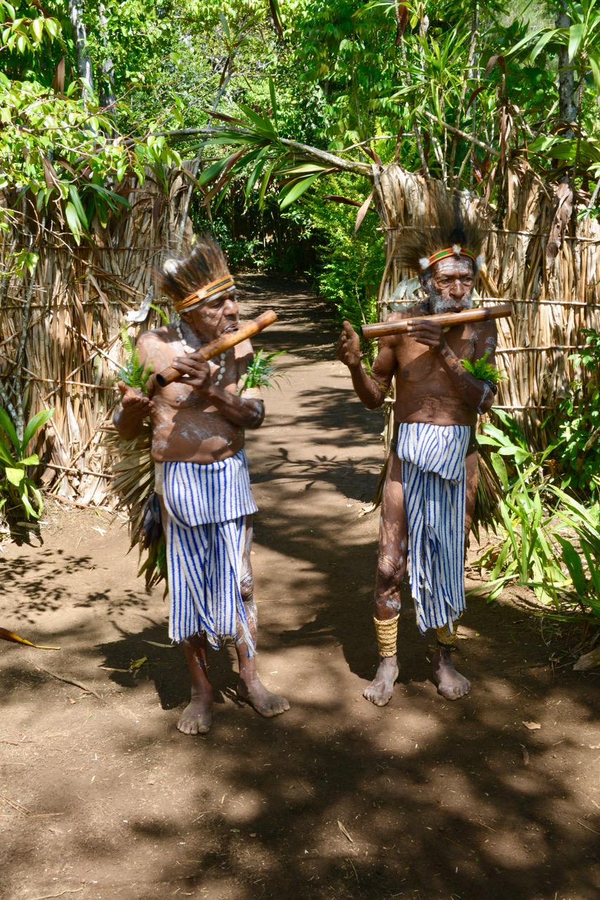 Pour commencer nous avons été accueillis par deux musiciens joueurs de flûte qui se tenaient à l’entrée de l’aire cérémonielle. Vint ensuite la danse autour d’un abri rituel où sont stockés des mâchoires de cochon, vestiges des cérémonies des années précédentes. Après quoi c’est avec bonne grâce que nos hôtes se sont soumis à une toute autre cérémonie : le moment des portraits !