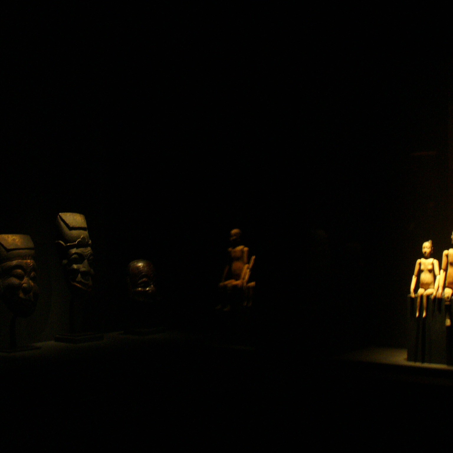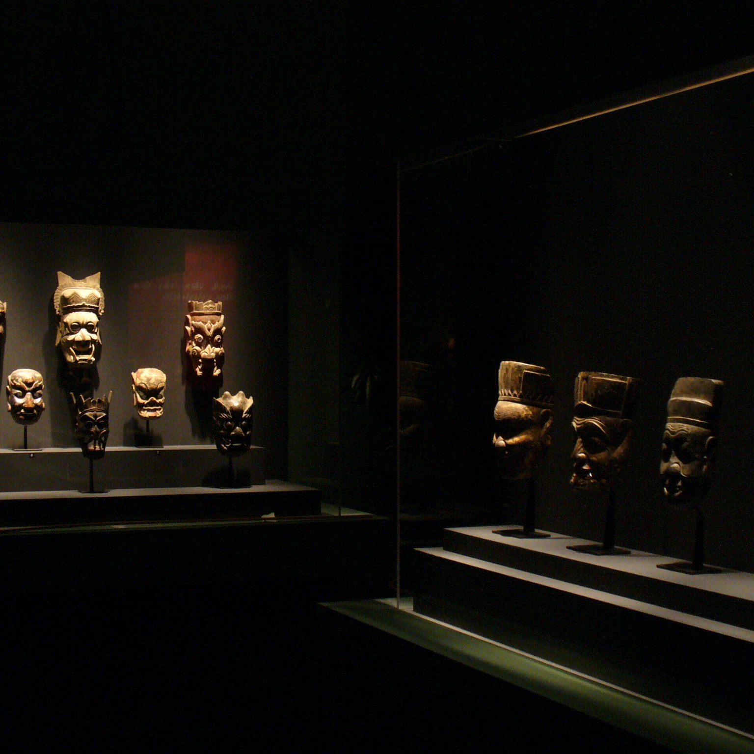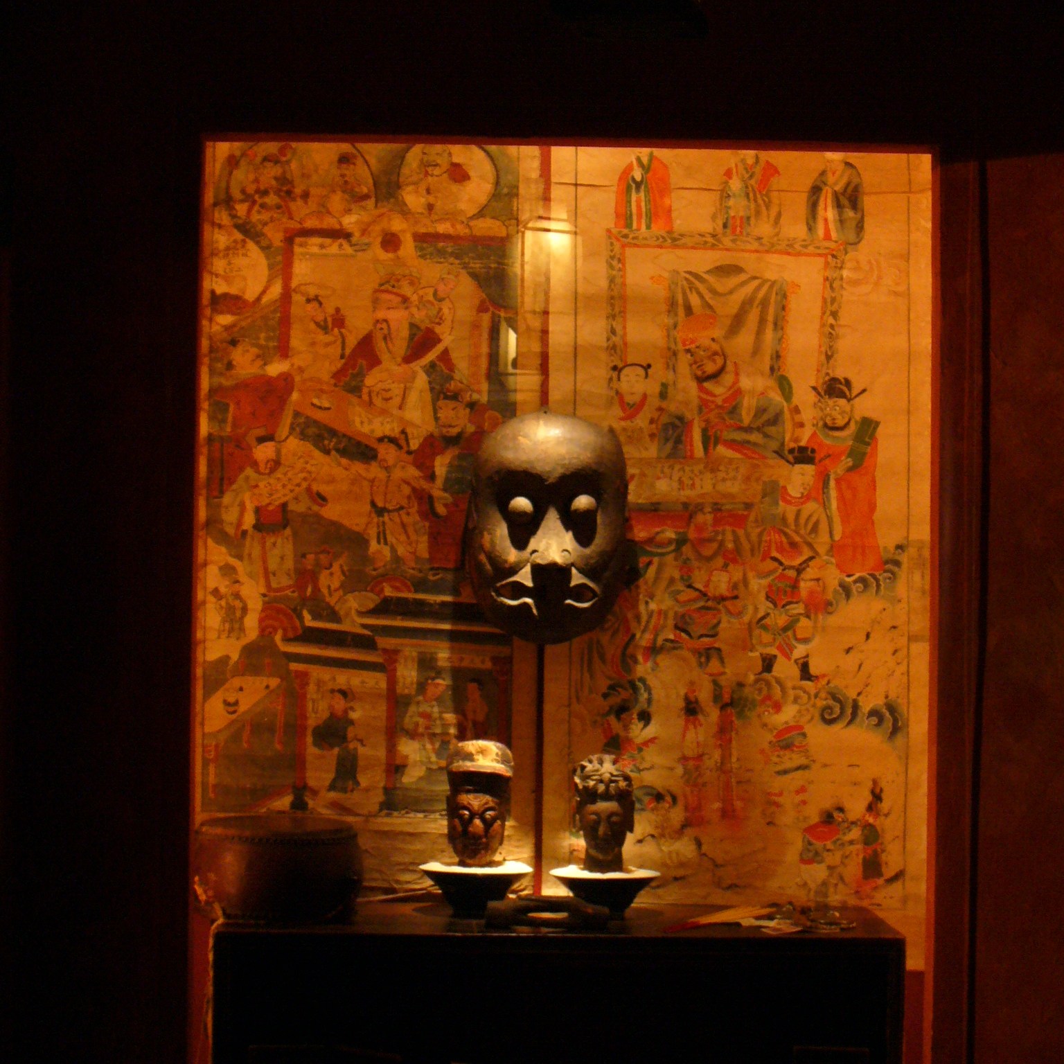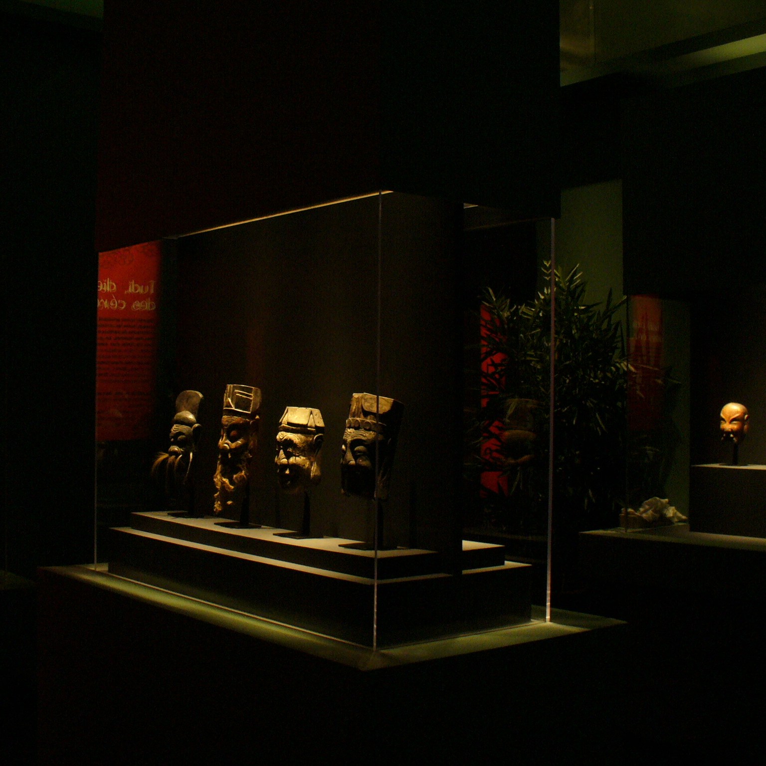 Les masques de Nuo sont le support d’un très ancien culte d’exorcisme (Nuo signifie « chasser les démons de la maison ») qui remonte aux temps néolithiques, et constitue le fondement de la religion populaire chinoise, d’essence chamanique. Le taoïsme s’y est ensuite glissé, le prêtre taoïste se substituant au chaman pour faire descendre les esprits néfastes, et les incarner dans les masques pour les rendre propices. Des représentations en témoignent dès l’âge de bronze, mais les oeuvres de bois ont évidemment disparu. Parmi les rares masques qui nous sont parvenus, confiés à des voyageurs occidentaux comme on jette une bouteille à la mer, certains peuvent remonter au XVI ° siècle ; mais pas plus tard que la Révolution Culturelle, 1966-1976, qui les a éradiqués. Dans les années 2000, les cérémonies ont pu reprendre doucement dans les villages des minorités montagnardes au sud du Yang-tse-kiang, mais le savoir faire était perdu. Aux temps originels du culte, les masques représentaient des personnages démoniaques, comme Leigong, le dieu du tonnerre, ou Kaishan, le dieu qui ouvre les montagnes. Ou des bêtes hybrides, comme le cochon-tigre (le cochon représente la prospérité, le tigre est avaleur de démons) Puis des personnages historiques ont rejoint le panthéon, comme Guan-Yu, héros de la guerre des trois royaumes à la fin des Han, devenu dieu de la guerre ; ou Mademoiselle avant-garde, dite phénix immortel, qui libéra son district des brigands dont son frère était le chef. Puis, avec l’urbanisation du temps des Song au X° siècle, le culte se laïcise un peu, et ajoute à ses acteurs des personnages de comédie dell’arte : Gansheng, l’étudiant lettré, son valet, le bouffon Qingtong, le moine Heshang, Maître Jiang, le professeur victime d’un corbeau, Qiu Gupo, la commère jalouse…Deux personnages sont centraux : Tudi Gong, le dieu de la terre, et Kailu, le chaman qui mène le cortège des masques dans tout le village. La chasse au petit démon, qui aura ainsi mobilisé des masques divers, de redoutables esprits apprivoisés, de prestigieux héros et des personnages de comédie, se déroule sur trois jours d’épreuves, de performances et de réjouissances, et prépare la paix et la salubrité du village.