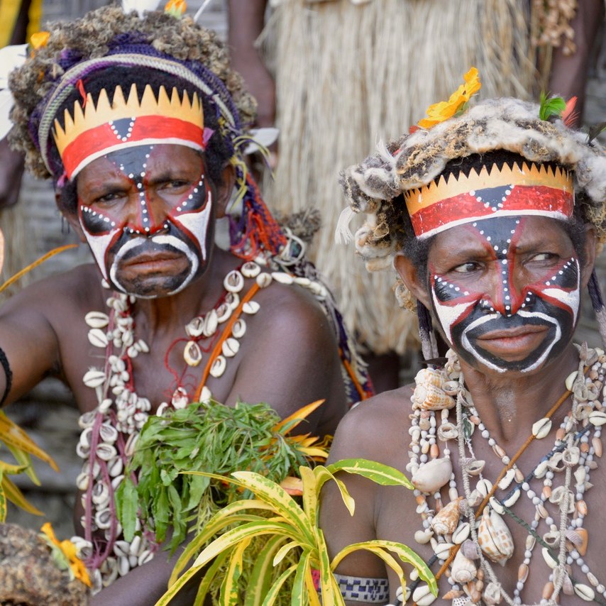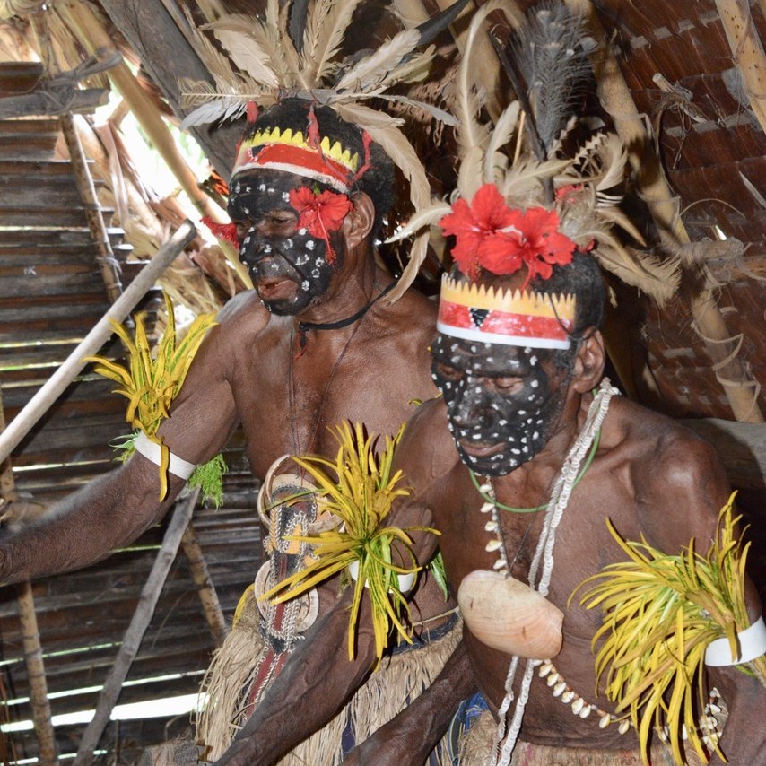 Contrairement à ce que nous avions pu voir à Kuminibus dans un autre village abelam neuf ans auparavant, les danseurs principaux n’ont pas les yeux occultés par le maquillage jaune qui entoure ceux-ci.