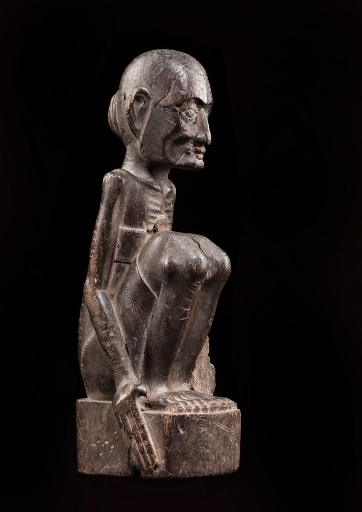 Bois dur à patine gris-brun incrustée, H:35 cm, Bali ancien, probablement XVIII° siècle ou antérieur (La poussée de l’Islam à la fin du XVII° a réduit la résistance des Madjapahit dans Bali, leur dernier bastion indonésien).