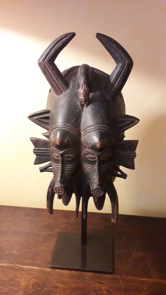Ici les crêtes du masque sont bi-sexuelles, cornes de taureau, et panthère assise. Mais le sculpteur a bien figuré quatre nattes, deux pour chaque face.