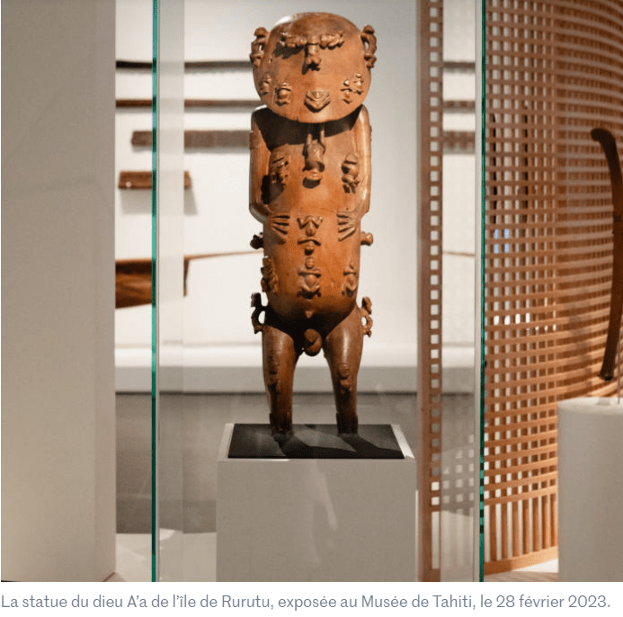 et, ci-dessous, la statue du dieu A’a, au sexe mutilé par les missionnaires, que nous avons pu admirer il y a quelques années au musée Branly à l’occasion de la très belle exposition « Océanie ». ; elle remonte à la fin du 16e siècle, ou au tout début du 17e ; elle a été sculptée à Rurutu, petite île des Australes, à près de 600 km au sud de Tahiti, en Polynésie française.