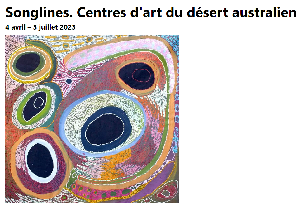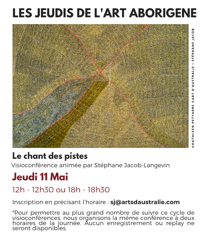 Parallèlement au succès de l’exposition Songlines au musée du quai Branly-Jacques Chirac, Stéphane Jacob, membre de notre association, depuis sa galerie Arts d’Australie, nous propose une visioconférence ce jeudi 11 mai, inscription obligatoire voir ci-dessous: