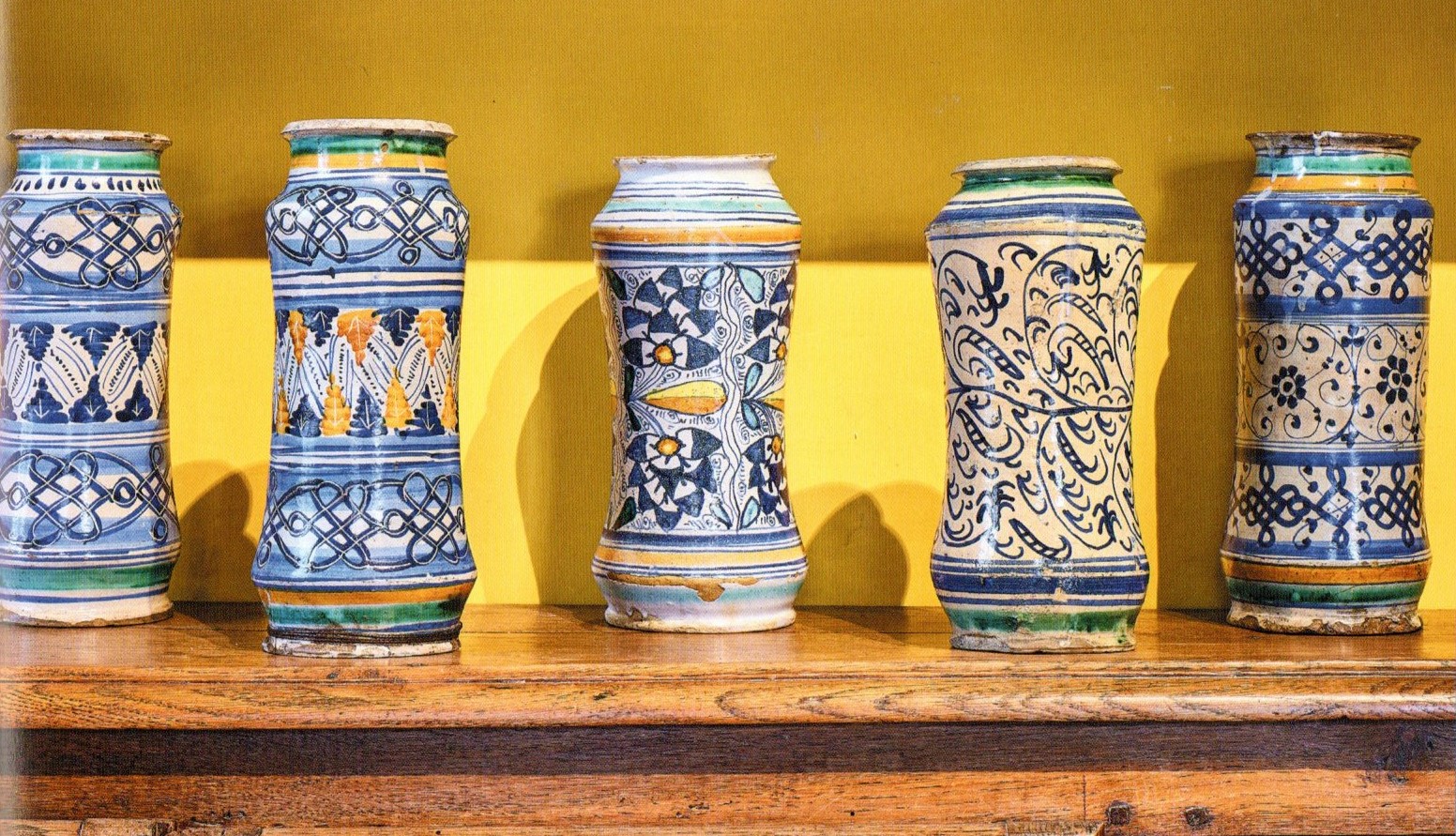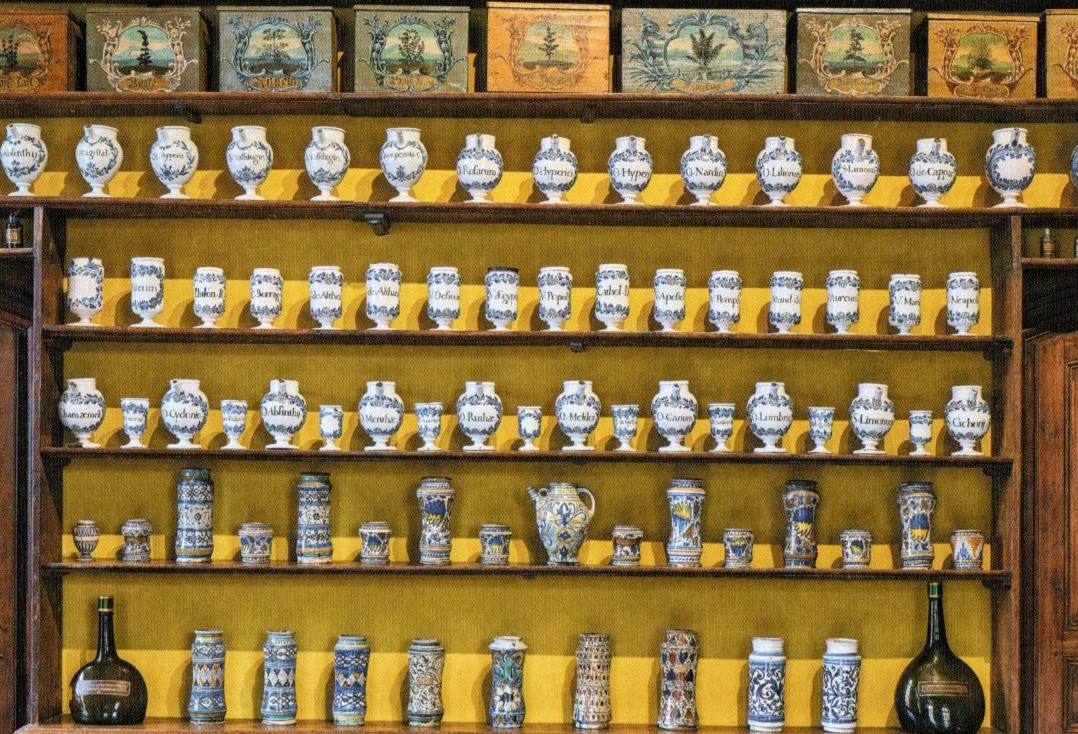 On trouve dans le même bâtiment une rare apothicairerie qui rassemble un nombre très important de pots en faïence majolique de différentes formes, albarello, pilulier et chevrette selon la matière qu’ils conservent, et, plus rares, 319 boites en bois peint, rectangulaires ou cylindriques, décorées d’arabesques et de plantes.