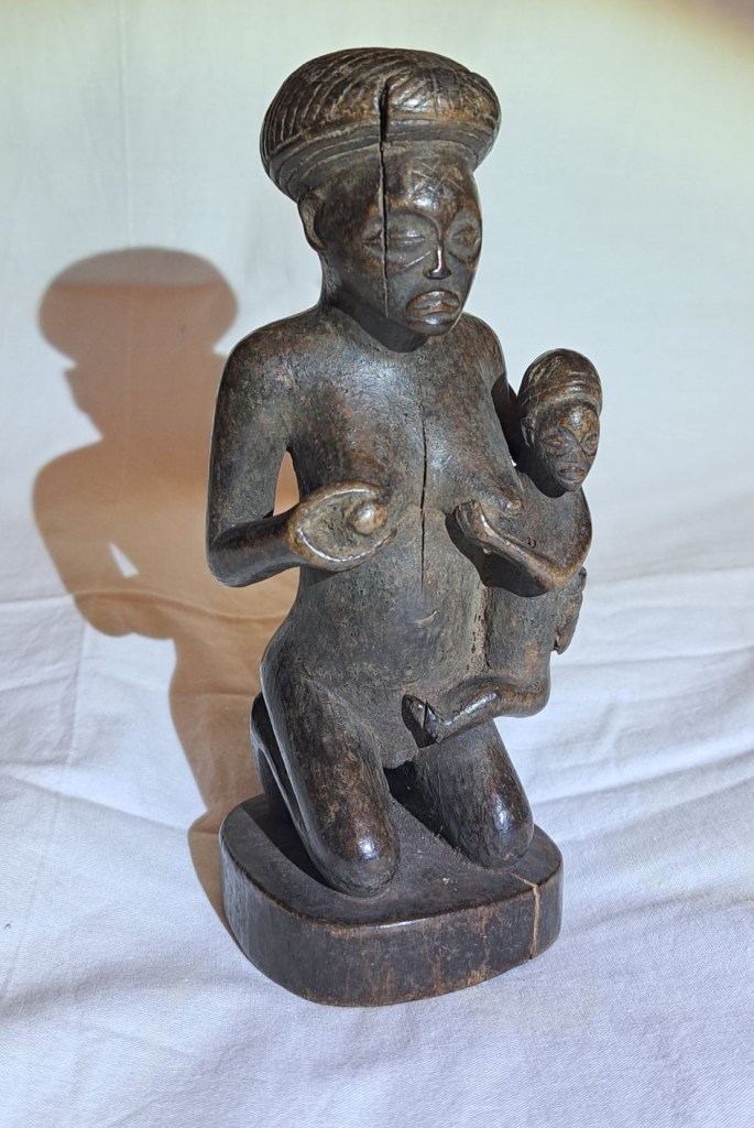 C’est Georges Harter qui nous l’envoie avec la légende suivante: Dame Lwena (la coiffe) qui a épousé un prince Tchokwé (la croix maltaise sur le front) et l’héritier sur la hanche. Merci à lui.