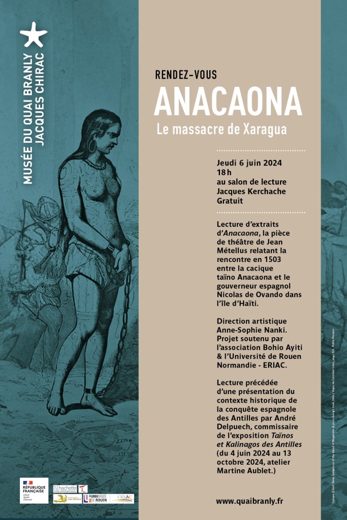 jeudi 6 juin à 18h au salon Jacques Kerchache, Anacaona, le massacre de Xaragua lecture d’extraits de la pièce de théâtre de Jean Métellus, précédée d’une présentation du contexte historique par André Delpuech commissaire de l’exposition « Taïnos et Kalinagos des Antilles » .