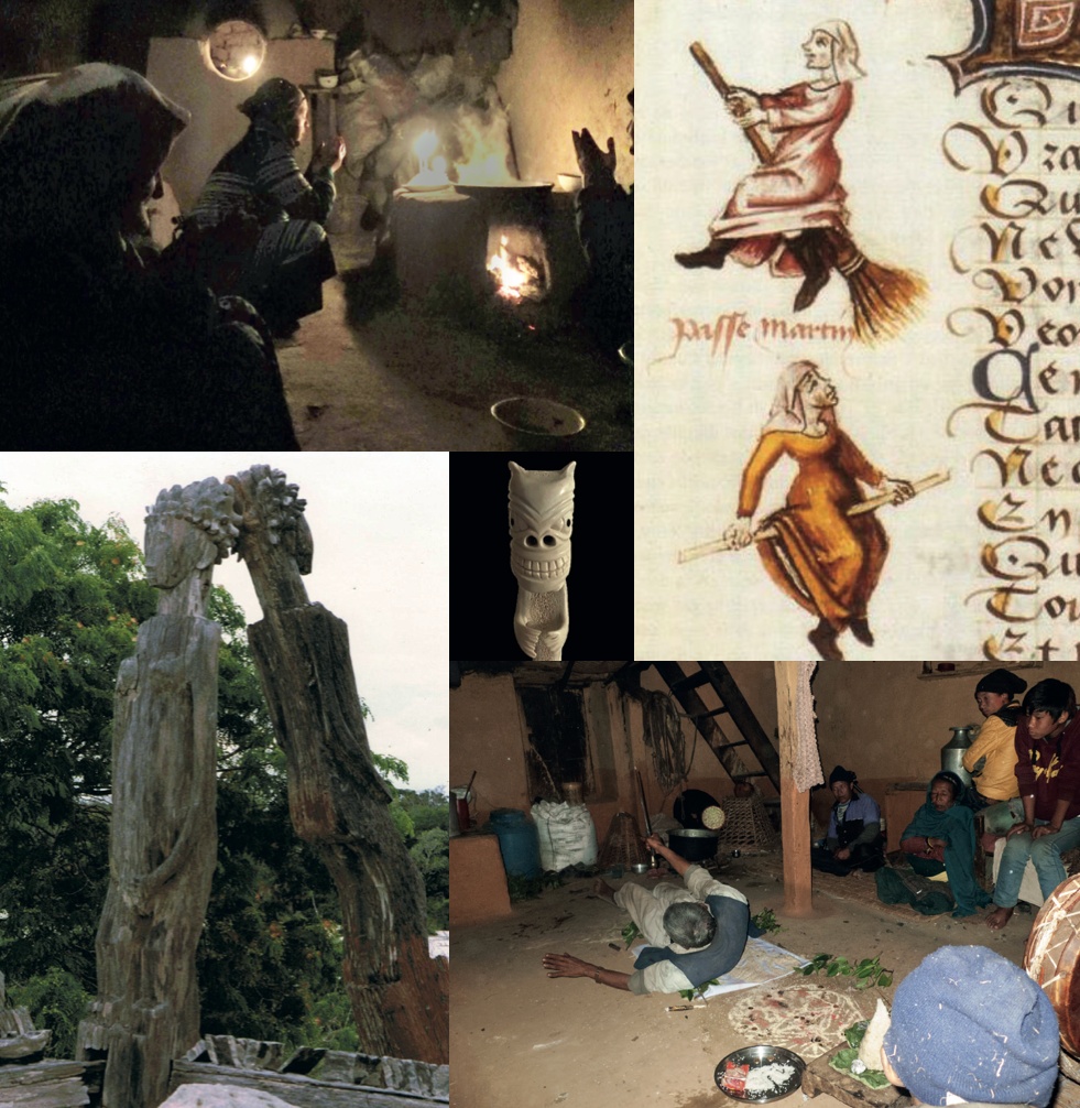 Ouverture du rituel du ko’ch. La cuisine transformée en temple, Tadjikistan, en 2015. © Sylvie Lasserre – Illustration tirée de Le Champion des dames (1440) de Martin Le Franc, représentant des sorcières chevauchant leurs balais – Sculptures funéraires sakalava (côte ouest de Madagascar) in situ, attribuées au sculpteur Horatsy (circa 1920) © Sophie Goedefroit – Nalikateq (sculpture en os). Période thuléenne récente (début XXe siècle). Arctique. Coll. GBB. © Maria Giuseppina Bruna – Chamane tamang engagé dans un combat lors de son voyage en esprit. District de Kavrepalanchok, Népal, 2015 © Adrien Viel.