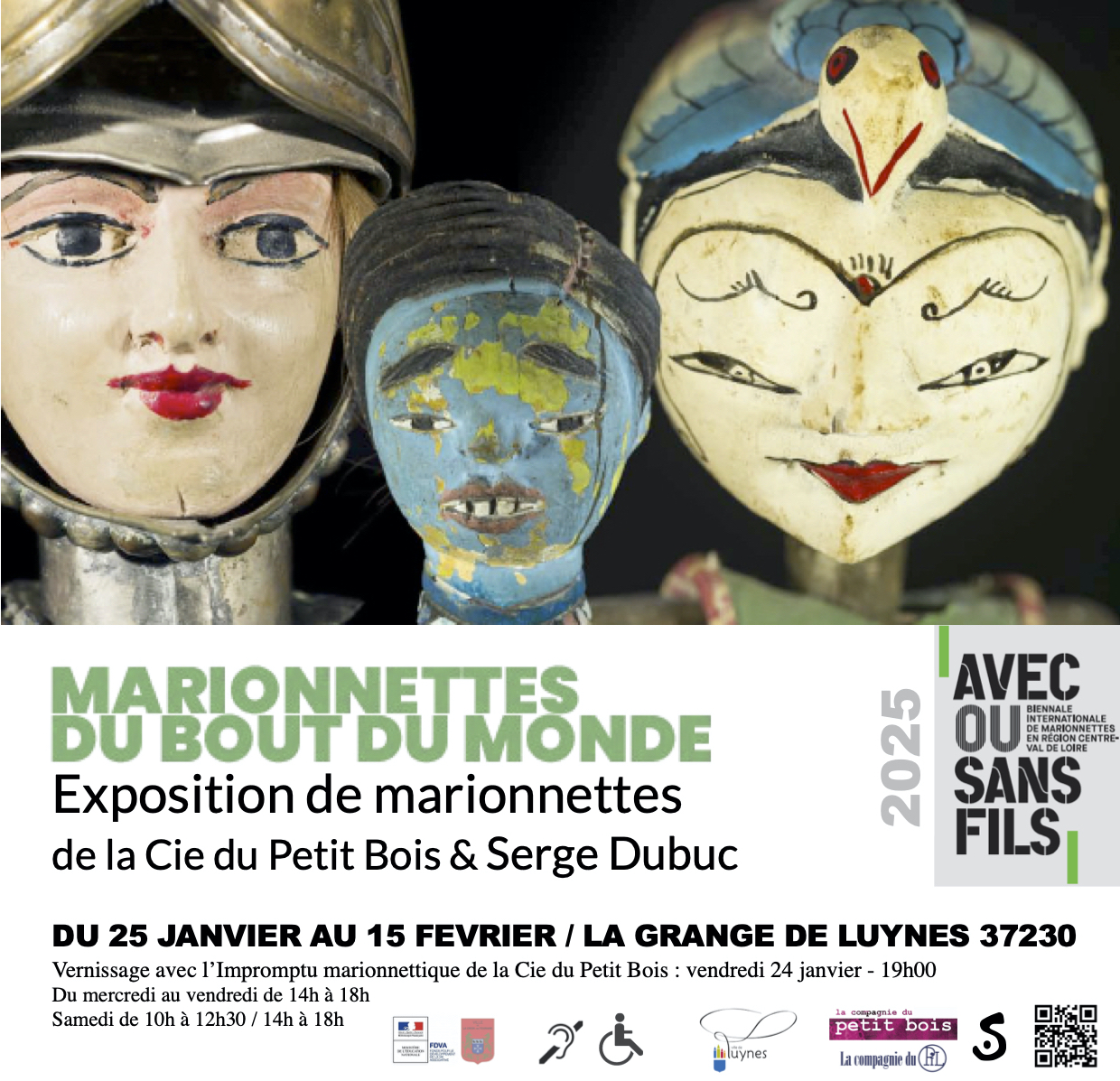 depuis le 25 janvier 2025 et jusqu’au 15 février à la Grange de Luynes 37230, dans le cadre de la biennale internationale de marionnettes en région Centre-Val de Loire, exposition de marionnettes « Marionnettes du bout du monde » présentée par la Cie du Petit Bois et Serge Dubuc, membre de notre association.
