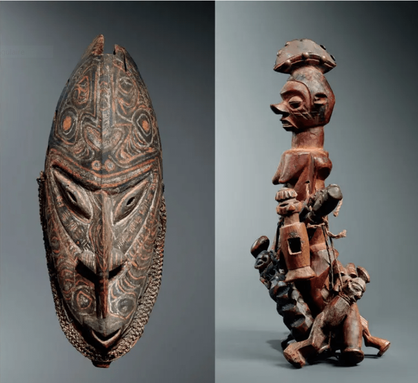 A gauche masque Bas-Sepik chez Voyageurs et Curieux, à droite figure yaka chez Schoffel.