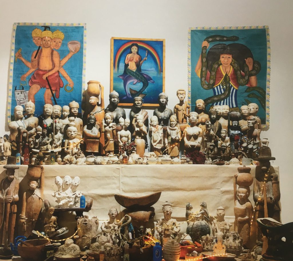 L’autel – le terme est assez européanocentré – désigne ici un espace de dévotion, un dispositif où se concentre la présence des dieux ou des esprits et où le « croyant » peut entrer en communication avec eux. C’est à la fois un lieu et un ensemble d’objets, une architecture, d’intérieur ou de plein air, qui peut convoquer aussi la peinture, la sculpture, les textiles, la céramique, les éléments naturels, le corps… C’est, comme l’indique J.H. Martin, l’ancêtre des « installations » tant prisées par les artistes contemporains. Les autels sont rarement présents dans les musées, qui souvent les démantèlent en fonction de leurs modes de classement, et c’est le premier mérite de l’exposition de les aborder et de les présenter comme tels, des ensembles intrinsèquement mixtes, et flous, solides ou éphémères, chaotiques ou soigneusement ordonnés.