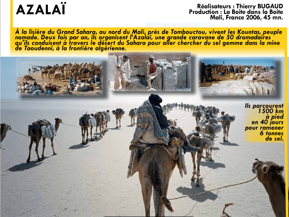 jeudi 22 mai à 18h30 en salle de cinéma du musée du quai Branly-Jacques Chirac, la Société des Africanistes propose la projection du film Azalaï de Thierry Bugaud en présence du réalisateur.