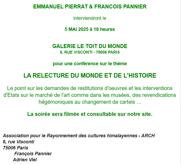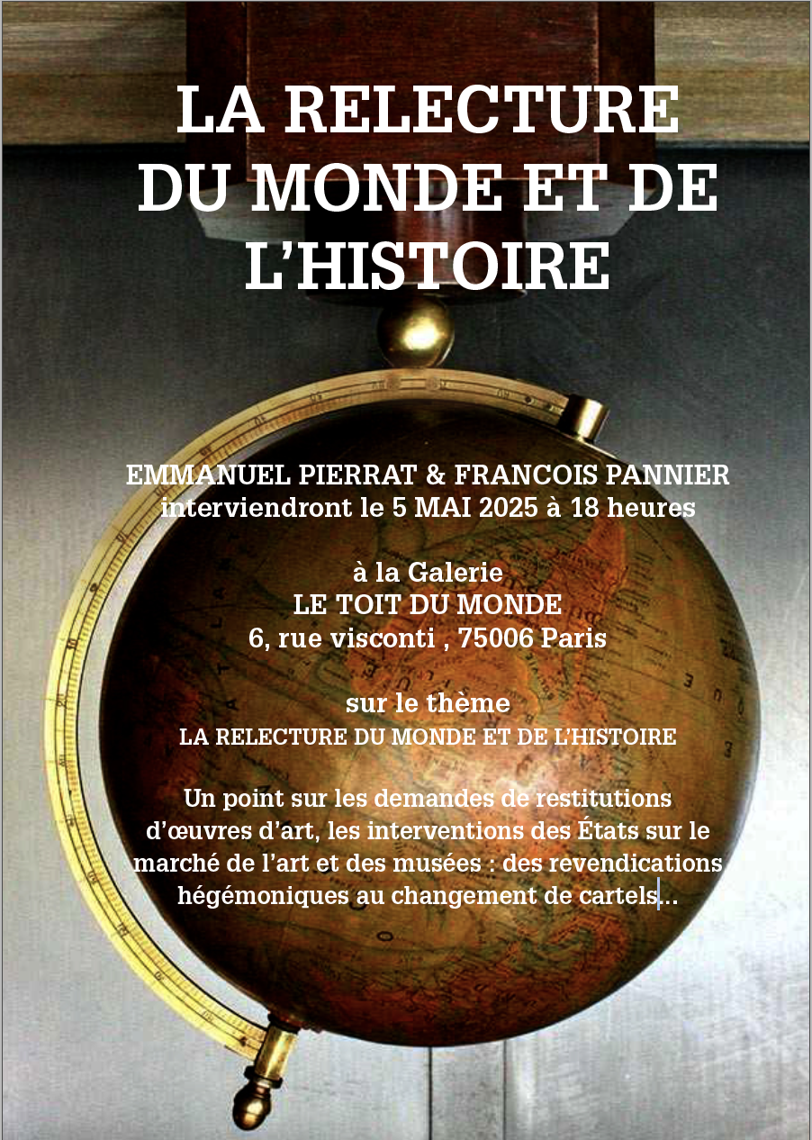 lundi 5 mai à 18h, à la galerie Le Toit du Monde, conférence de Emmanuel Pierrat et François Panier sur le thème « la relecture du monde et de l’histoire ».