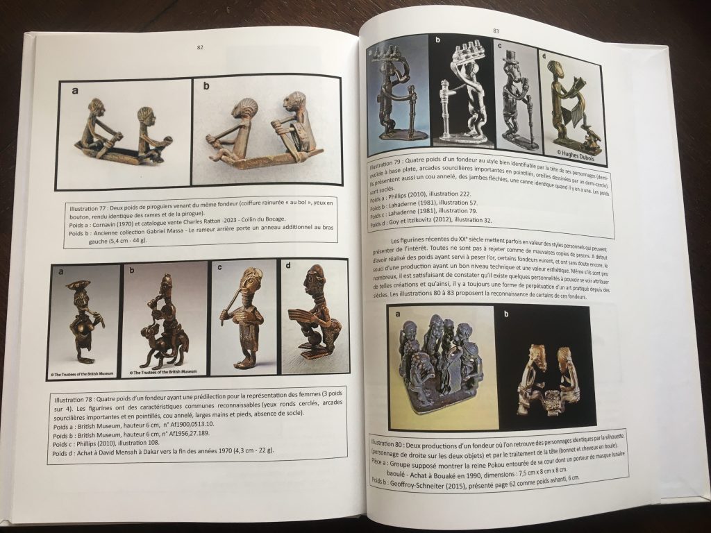 Le commerce de l’or se voit évoqué de l’Antiquité à la conquête coloniale. Les poids sont, quant à eux, décrits dans leur fabrication, leur classification, leurs usages de prestige, ou courants, et abordés aussi sous l’angle esthétique, qu’ils soient géométriques ou figuratifs. Représentations d’objets usuels, d’instruments de musique, d’armes, d’animaux, de plantes, d’activités humaines, (chasse, travail, musique, etc.), on découvre tout un univers miniaturisé dans des figures de quelques centimètres. La métrologie, si importante pour l’usage de la pesée, est décrite également. Et l’ouvrage s’achève par une approche stylistique, qui va jusqu’à la recherche de mêmes mains dans la création des figures d’ethnies Akan, Baoulé, ou Agni. Produit en autoédition, bien relié, richement illustré, l’ouvrage va s’imposer comme un document de référence pour les amateurs.