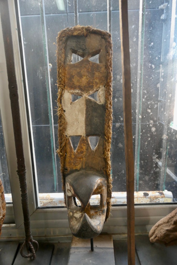 Un étonnant masque de danse Tiv (Nigéria) réversible. Il se porte en cimier, mais si on porte le masque de la partie supérieure sur le visage, la partie inférieure devient une sorte de coupelle.