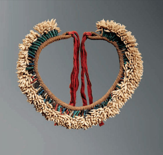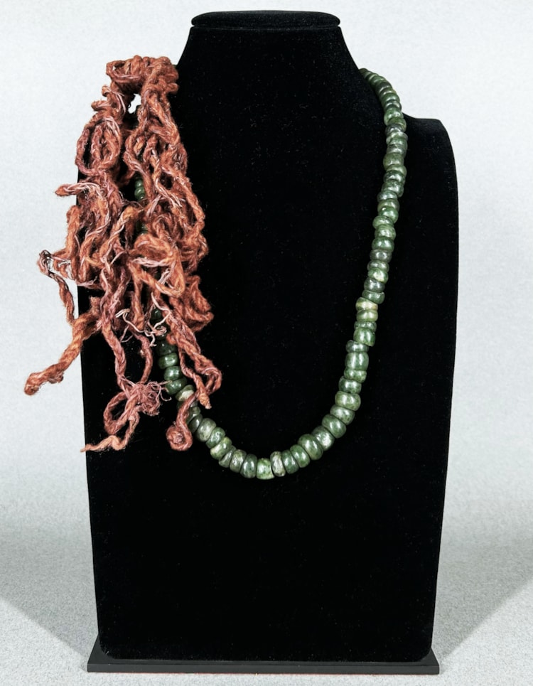 collier de monnaie de 135 perles de ouénite verte, écheveau de fibres de coco et cordon de poils de roussette. Peuple kanak. Ile de Ouen, Nouvelle-Calédonie