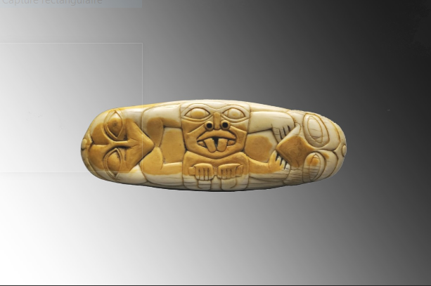 charme de chamane en ivoire de cachalot. Haïda Gwaï Colombie-Britannique. Canada. recto-verso