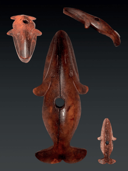 Amulette, grande baleine , île Saint-Laurent, détroit de Béring, Alaska. culture Punuk 500-1000 après JC. défense de morse minéralisée