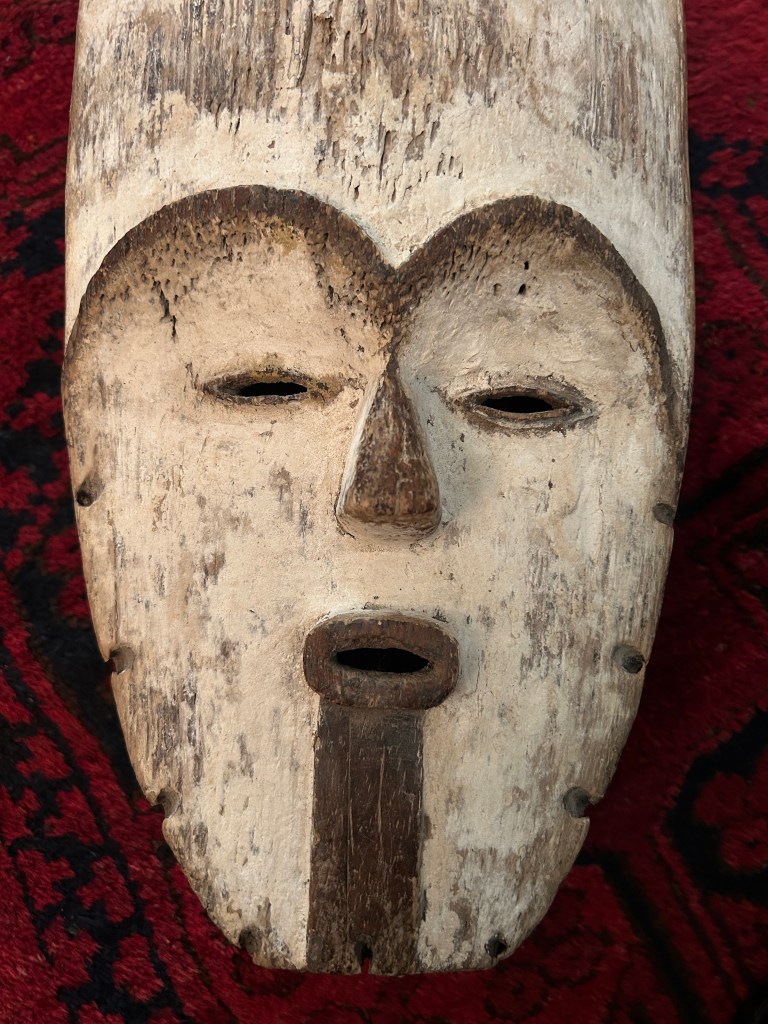 Ce qui fait que ledit masque serait certes ancien (début 20ème siècle) mais inauthentique car il n’aurait jamais été utilisé (ni servi, ni dansé). J’ai pas moi-même vérifié sur place que l’intérieur du masque montrait bien son caractère ”tout neuf” : aucune marque de transpiration, ni d’usure sur les bords du masque, ni aucun accident que l’on trouve pratiquement toujours sur les masques qui dansent.