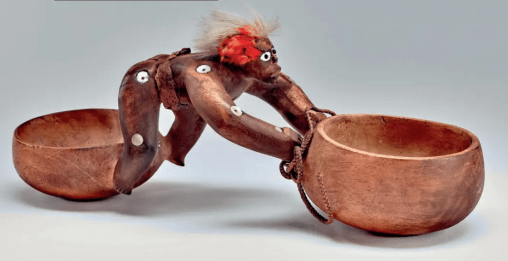 bol double avec personnage . Hawaï. fin XIXè, début XXè, bois, nacre, plumes, fourrure. British Museum