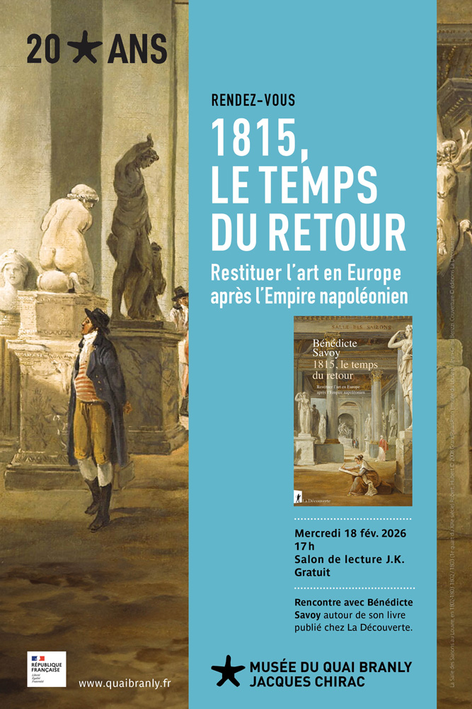 Mercredi 18 février à 17:00 au salon J.Kerchache à 17h au musée Branly, rencontre avec Bénédicte Savoy autour de son livre publié chez La Découverte : « 1815, le temps du retour. Restituer l’art en Europe après l’Empire napoléonien »