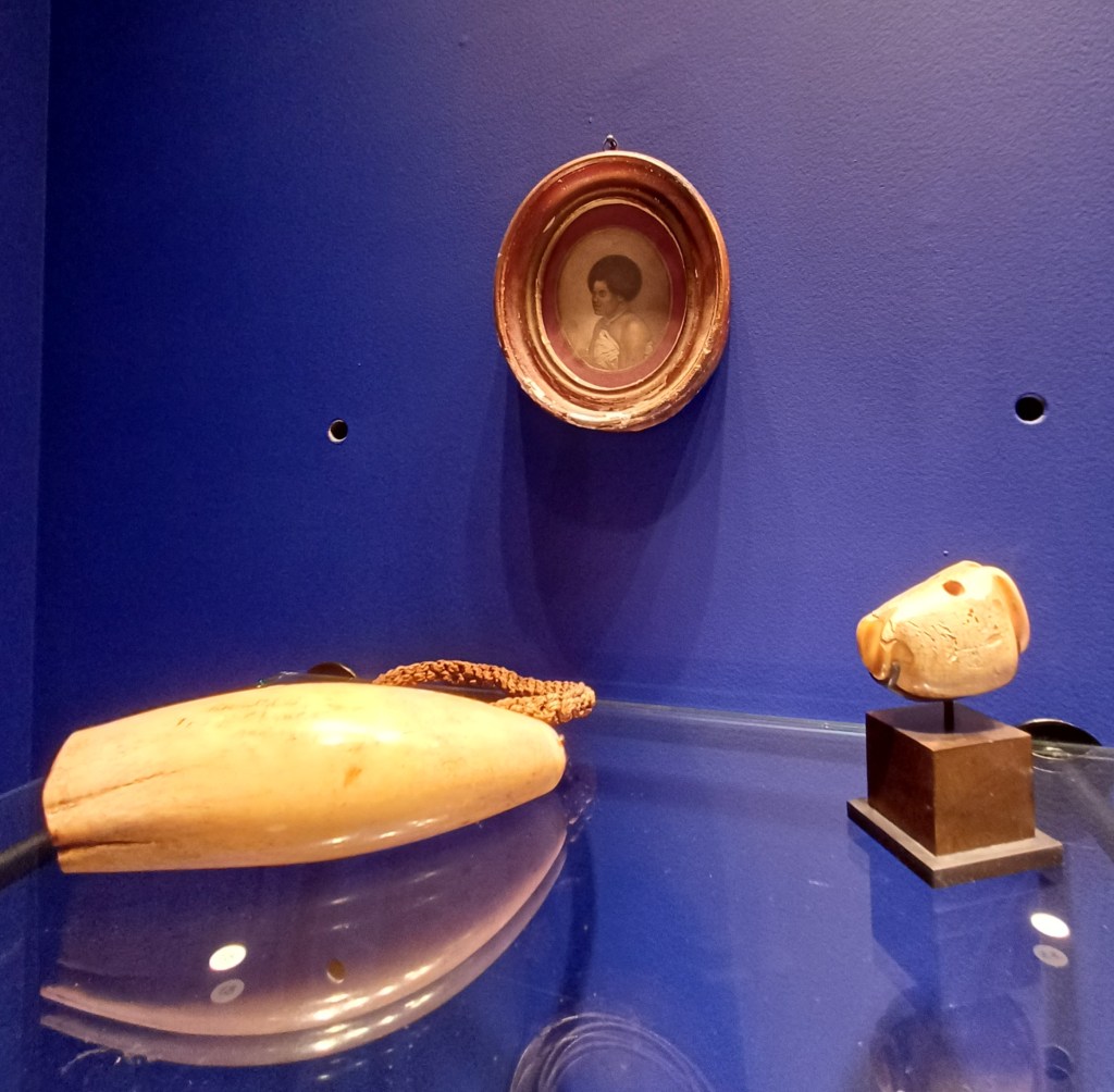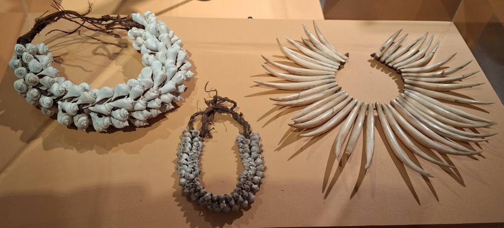 Enfin, un grand classique de Fidji un tabua, pendentif fait d’une dent de cachalot polie, suspendue à un collier de fibre de coco magnifiquement tressée. C’est un objet culturel important aux Fidji. Il est près d’un autre pendentif rare, également en dent de cachalot, ancien et très curieux, représentant deux vagins.