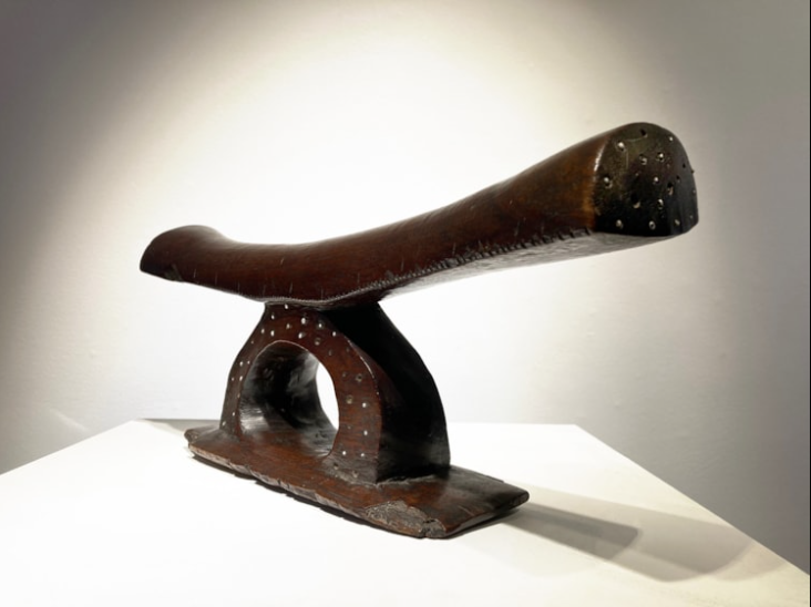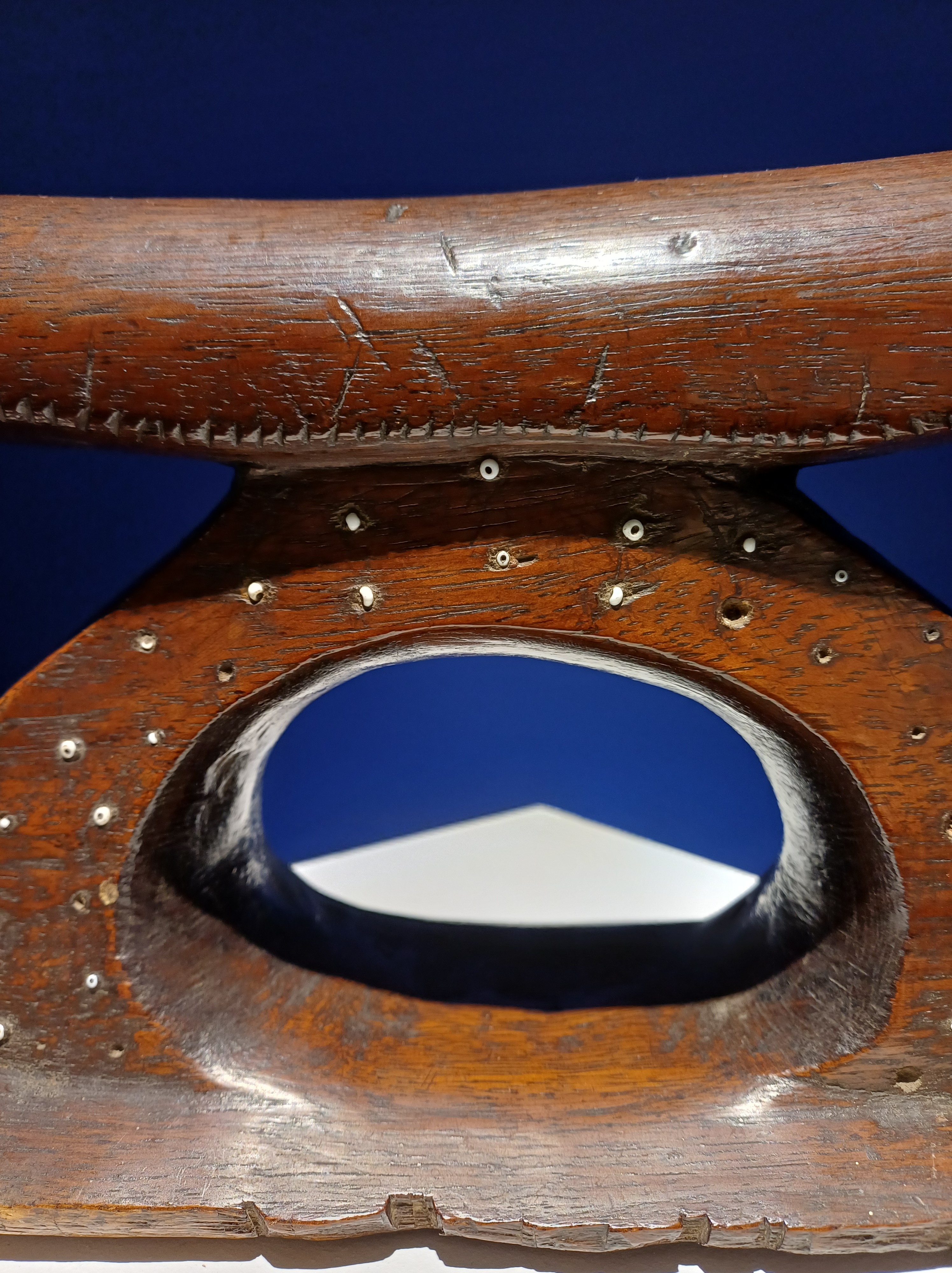 Puis un imposant et finement sculpté appui-tête kali remarquable par l’incrustation de minuscules perles de verre blanches :