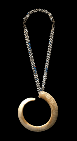Des objets déjà connus des habitués de la galerie, telle la parure faite d’une dent de cochon suspendue par des fibres entrelacées de minuscules perles de traite bleues et blanches: