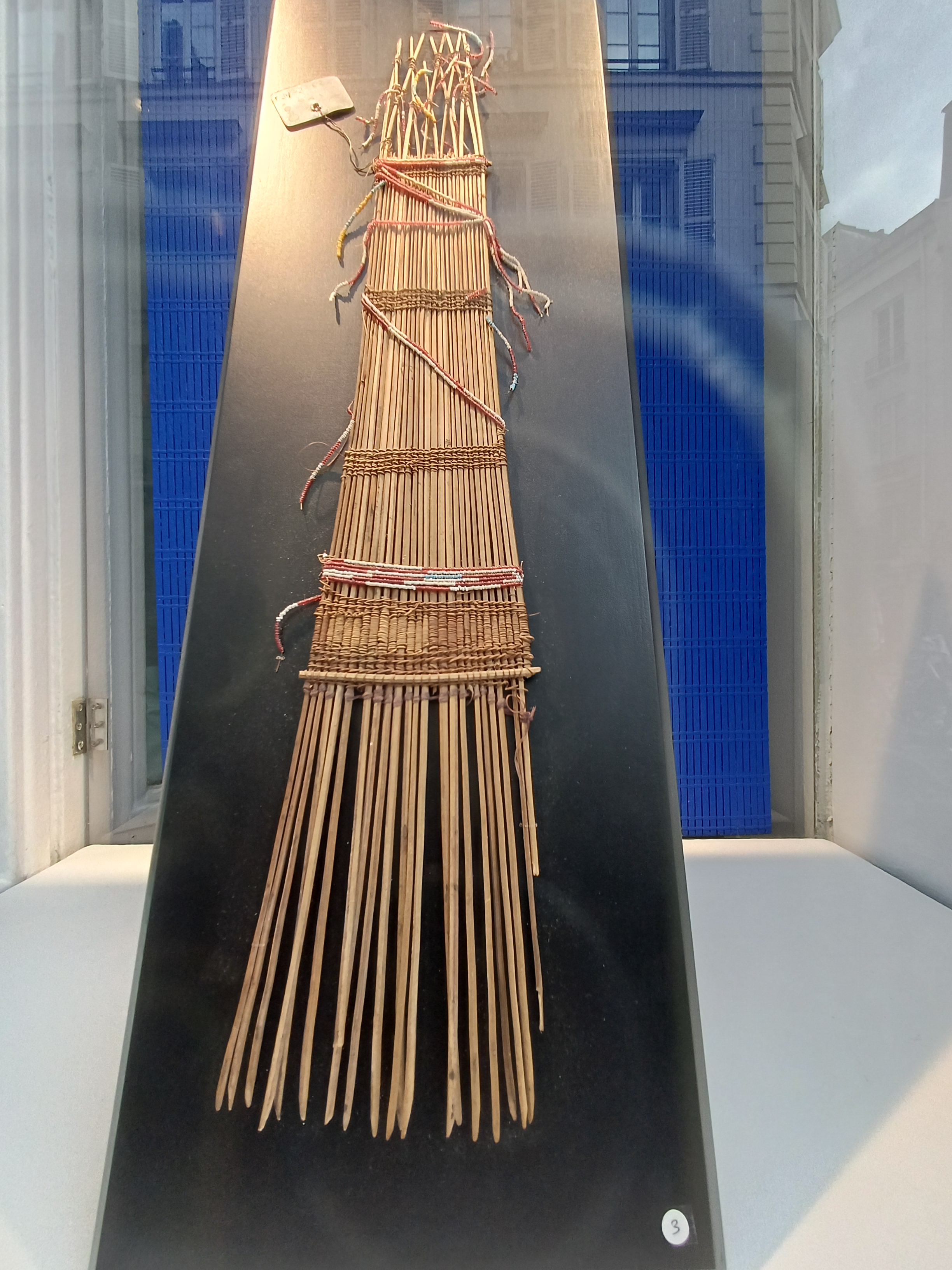 Dans les vitrines, se mirant dans la rue des Beaux-Arts, un peigne rapporté par la Korrigane aux longues et fines dents entrelacées de minuscules perles de couleur, et de l’autre côté trois I Ula Drisa,très anciennes massues de jet courtes.