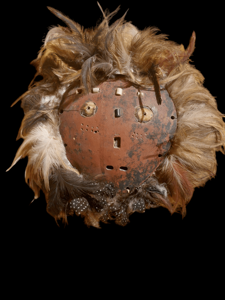Contrairement au bois des masques habituels, la calebasse, matériau léger et périssable, insiste sur l’humilité de l’impétrant. Perles et os expriment la lumière de la connaissance, et les plumes d’oiseaux la sublimation de l’esprit. Cette triade incarne avec élégance le parcours initiatique du Bwami.